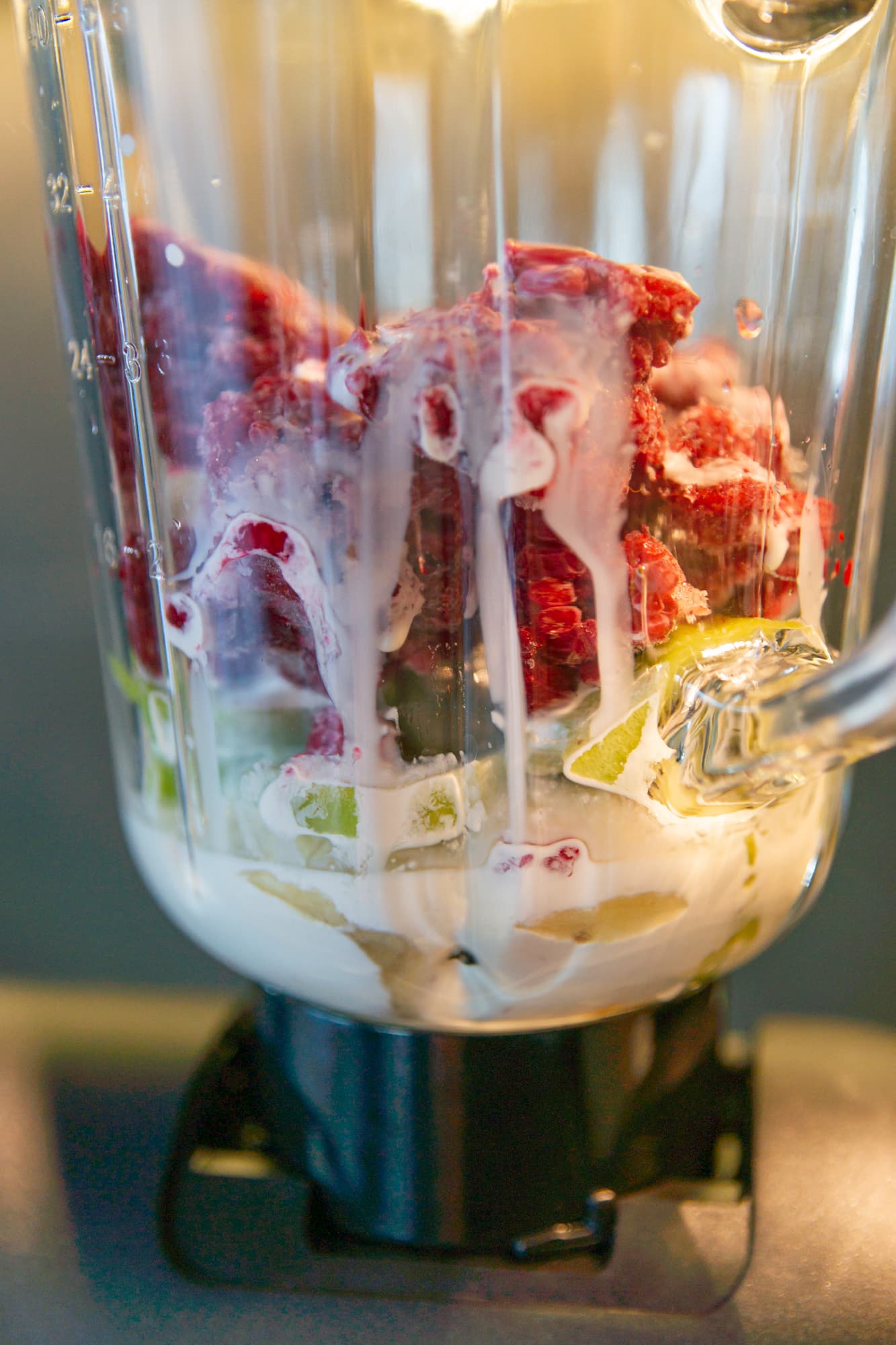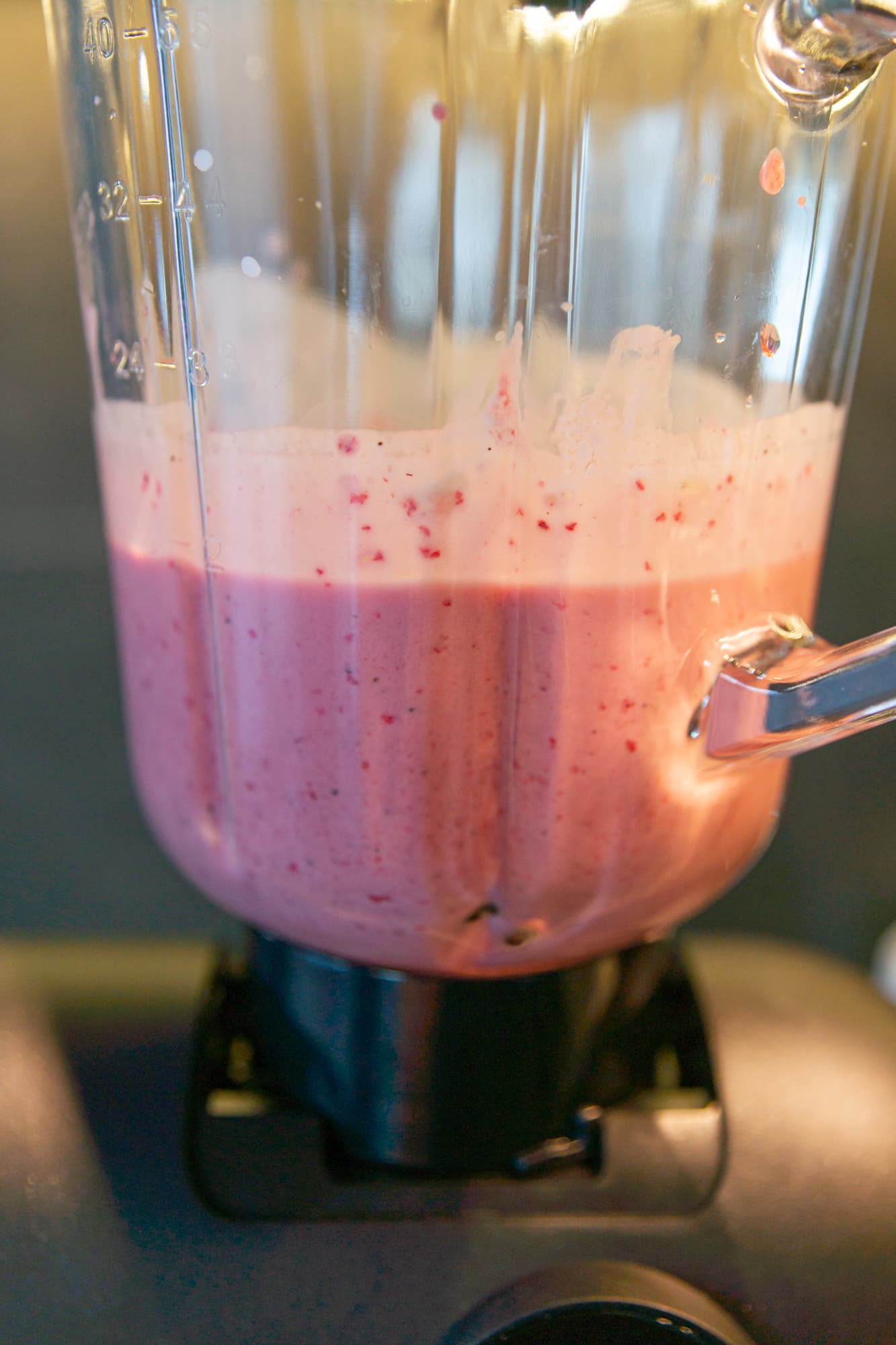 Теперь проверим, насколько хорошо прибор справится с ягодами прямо из морозилки. Ингредиенты сложили в кувшин в следующем порядке: банан, киви, замороженная малина в соотношении 1:1:2. Добавили немного молока и включили блендер, снова на 7-й скорости.