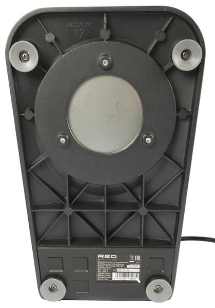 Дно устройства оснащено четырьмя ножками-присосками. Рядом наклеен шильдик с технической информацией и наименованием модели.