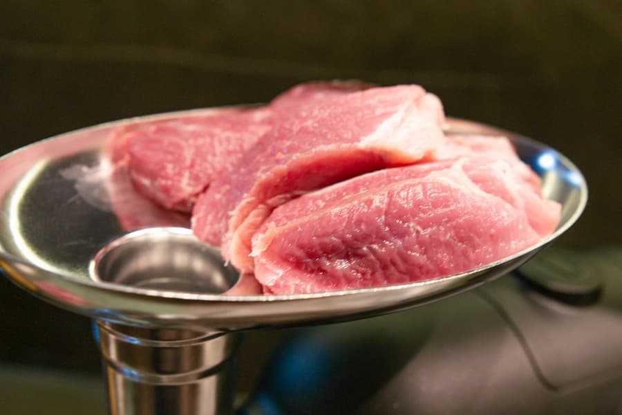 Для определения эффективности мясорубки мы традиционно использовали килограмм свиного окорока. Нарезали его на длинные куски, свободно проходящие в горловину. Решетку установили среднюю.