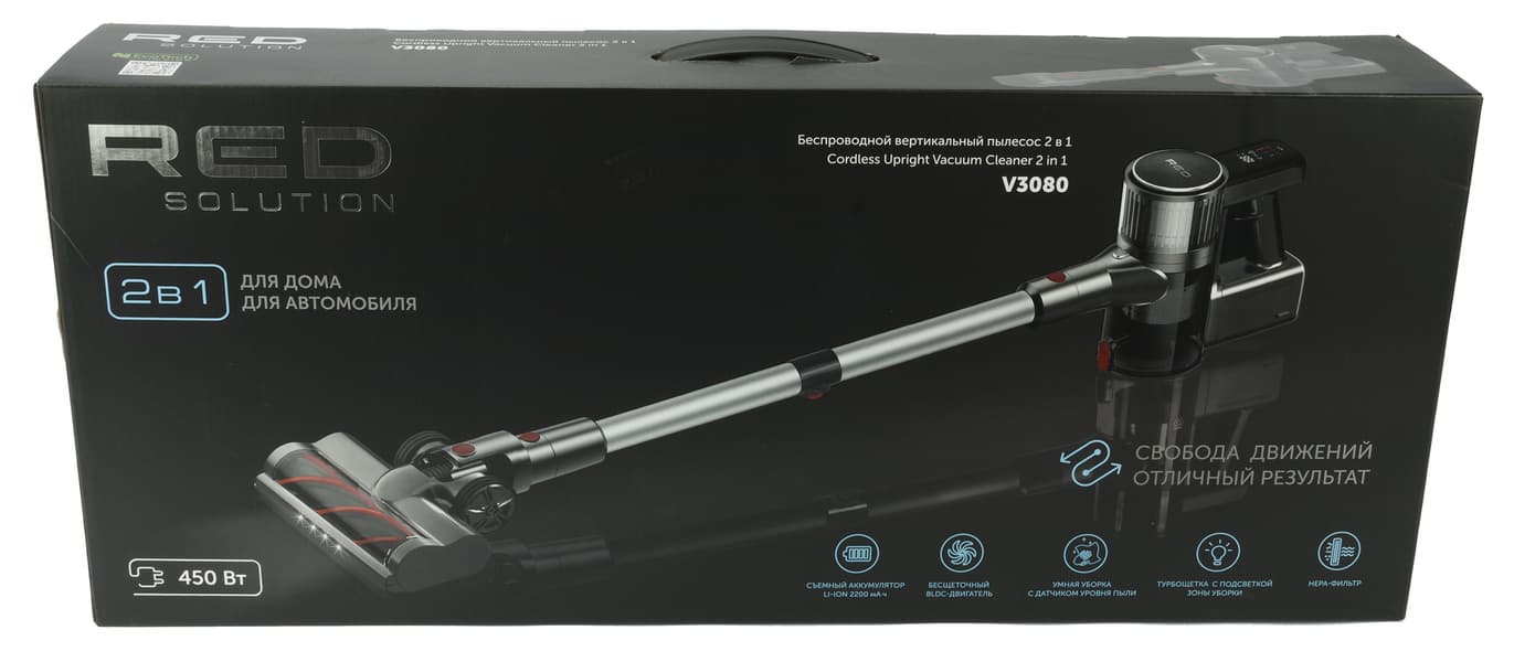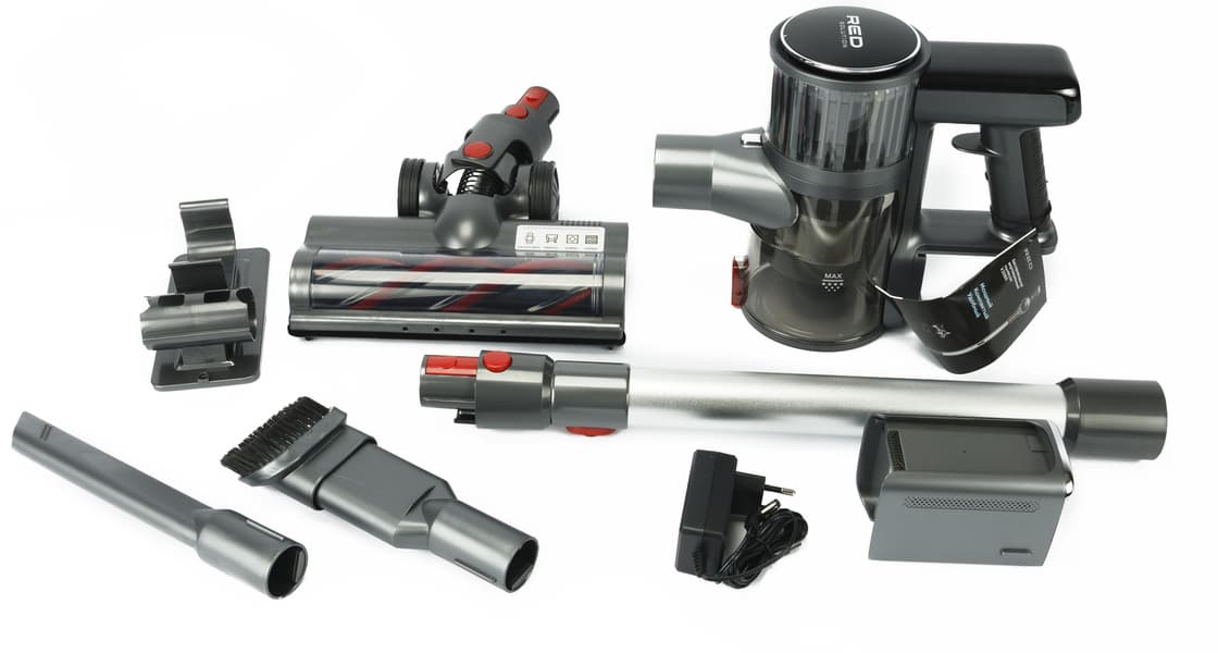 Основные особенности модели, на которые компания Red сочла нужным обратить внимание будущего владельца, — съемный литий-ионный аккумулятор емкостью 2200 мА·ч, бесщеточный BLDC-двигатель, наличие датчика загрязнения, турбощетка с подсветкой рабочей зоны и HEPA-фильтр, класс которого не указывается.