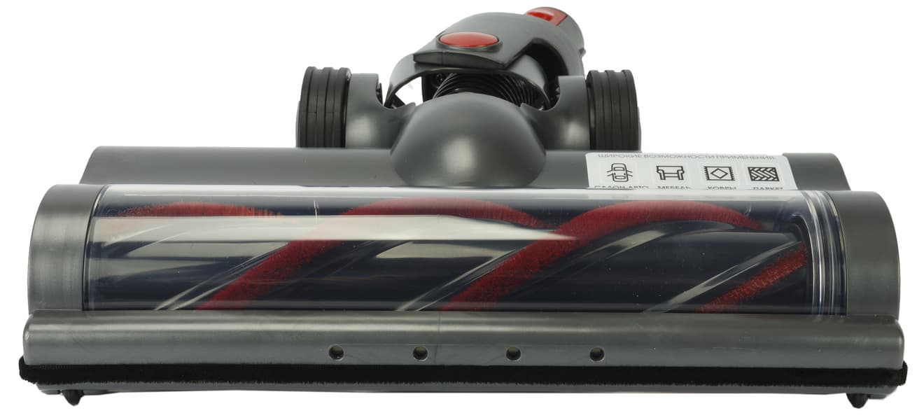 В конфигурации для уборки пола основной вес пылесоса приходится на два больших обрезиненных ролика в «пятке» насадки. Еще два небольших колеса размещены в передней части, а для улучшения прилегания к поверхности и облегчения скольжения предназначены щеточные элементы сзади и по бокам от ротора.