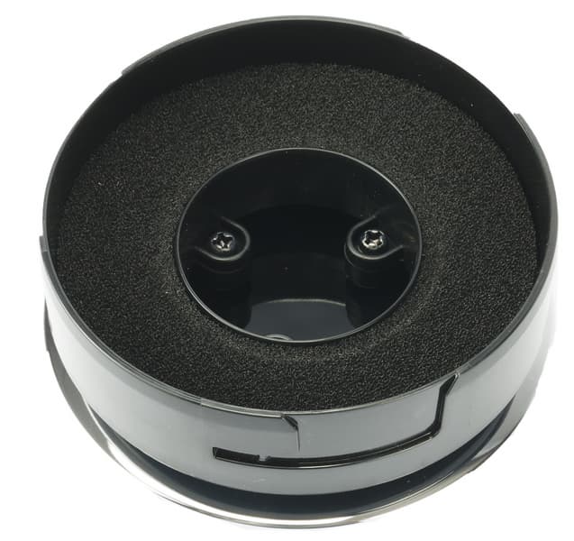 Верхняя крышка, под которой скрывается фильтр тонкой очистки, выполнена из такого же гладкого черного пластика и украшена серебристым логотипом производителя. По периметру между ней и корпусом расположено кольцевое выпускное отверстие.