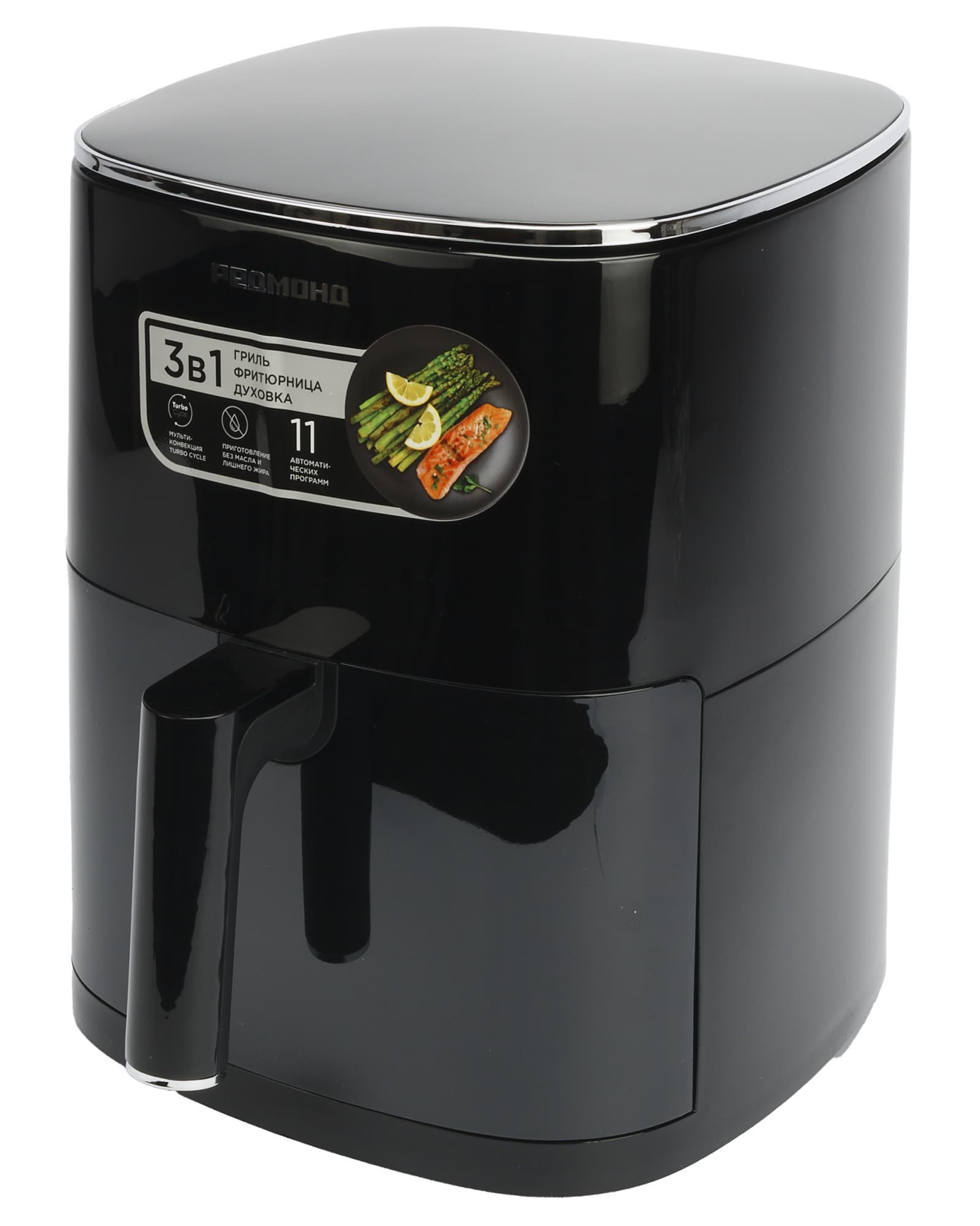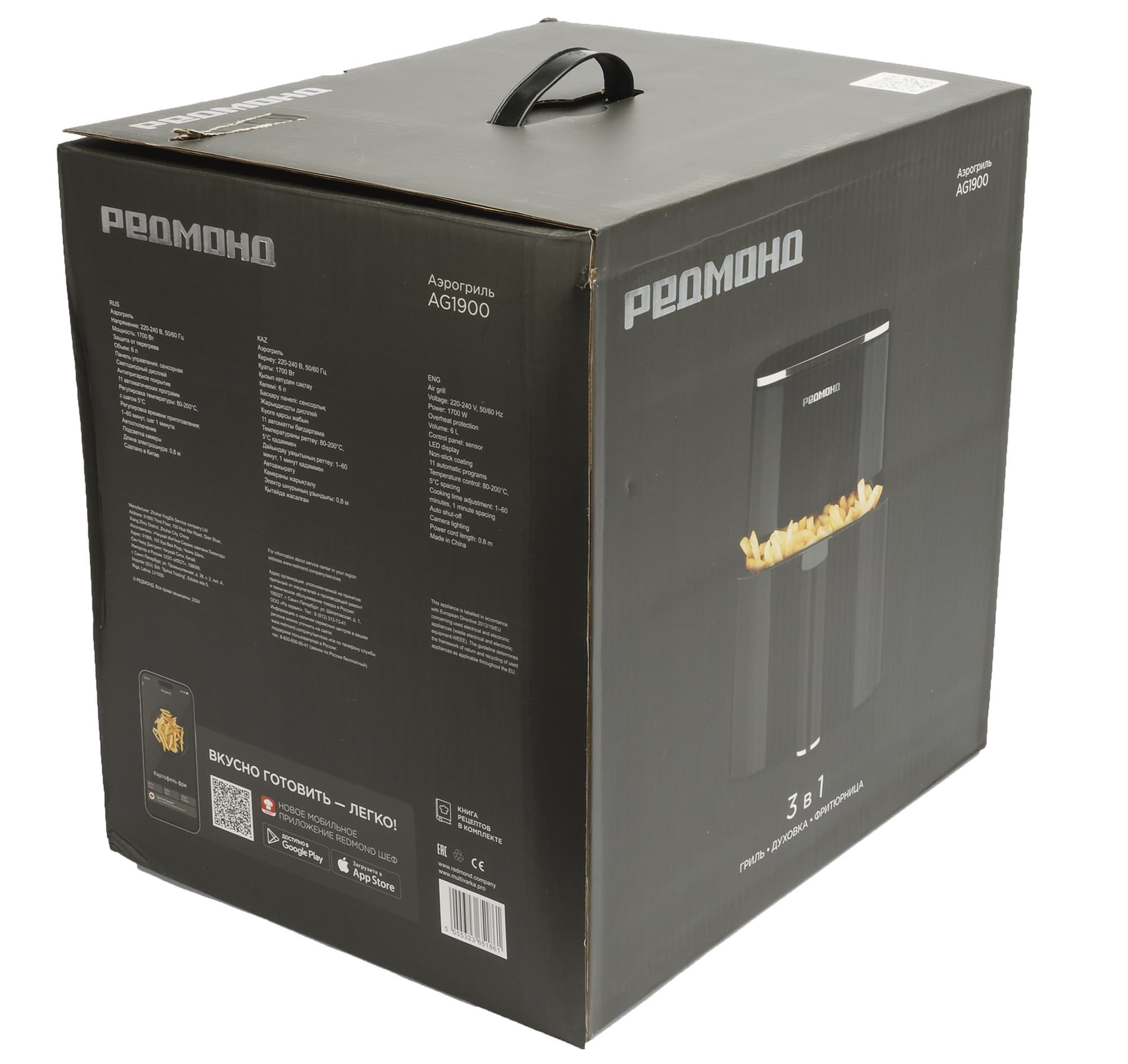 Аэрогриль Redmond поставляется в коробке, оформленной в фирменном стиле. На упаковке размещены фотографии: на одной стороне — аэрогриль с приготовленной картошкой-фри, на другой — фотография прибора в целом, на боковой стороне — верхняя панель гриля с кнопками выбора автоматических программ приготовления и особенностями эксплуатации прибора, на другой боковой стороне указаны технические характеристики устройства.