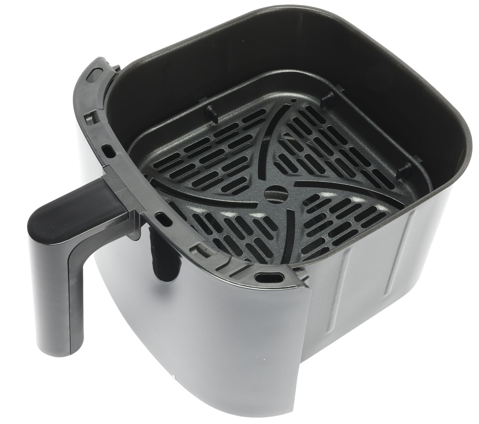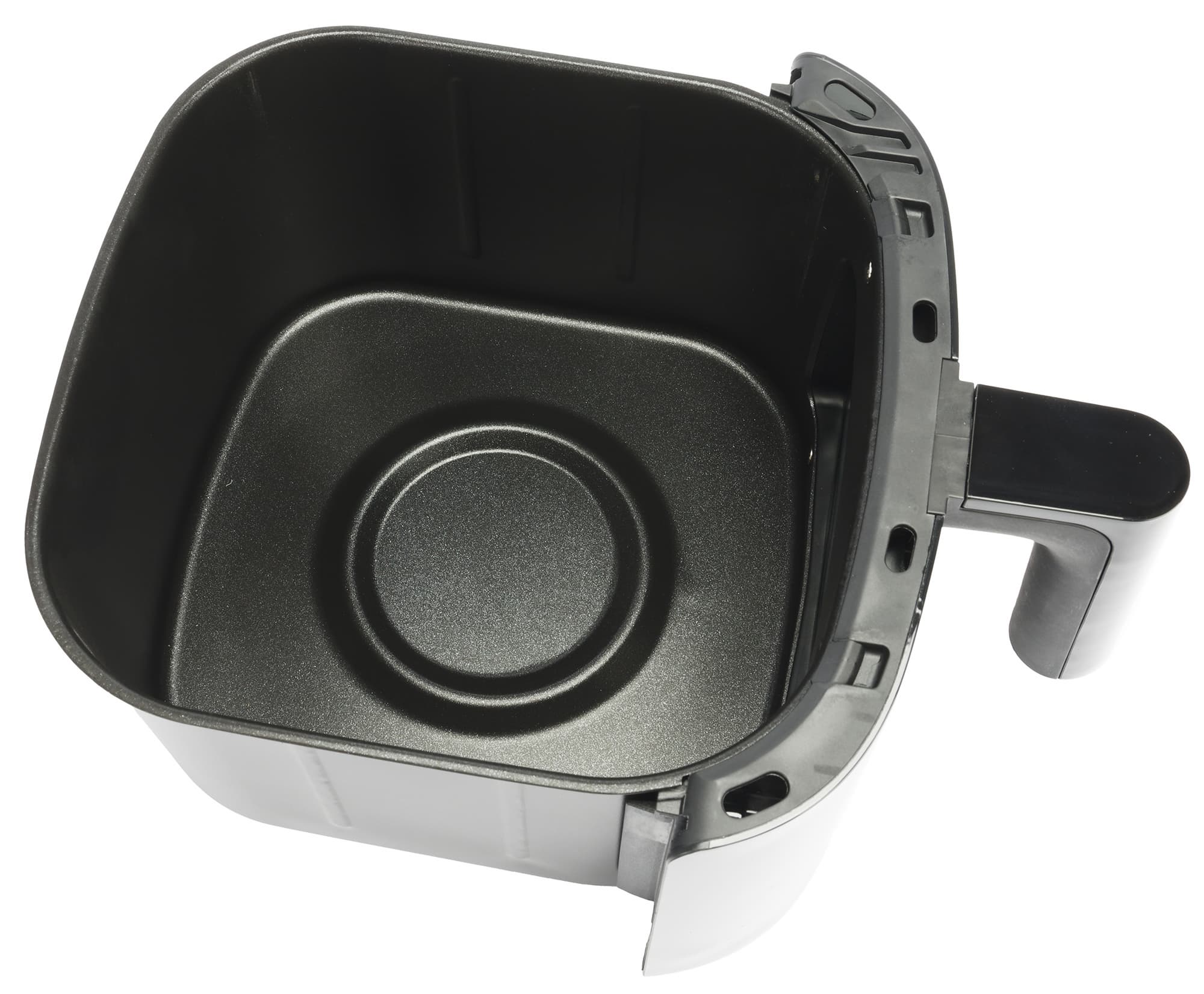 Чаша аэрогриля выдвигается с помощью ручки, что хорошо видно на фото ниже. Интересной особенностью гриля является прозрачное окно в чаше, причем, как мы видим на фото выше, когда чаша находится в гриле, никогда не подумаешь, что там есть окошко. Но стоит включить подсветку в приборе (или посмотреть на чашу на просвет), и тогда становится понятным, что там стекло, через которое можно наблюдать за процессом приготовления.