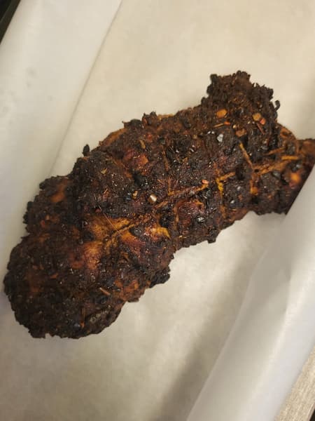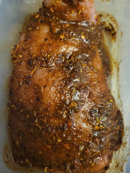 Начать мы решили с пастрами из индейки. Смешали растительное масло с травами, сушеным чесноком, паприкой, солью и перцем. Натерли мясо этой смесью со всех сторон и отправили на ночь в холодильник, чтобы оно промариновалось.