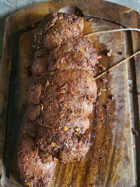 Далее мы перешли к самому сложному этапу: обвязать мясо кулинарной нитью. Говорят, что можно и просто завернуть мясо в фольгу, но в фольге оно начинает разваливаться, а при использовании кулинарной нити, как выяснилось, нет.