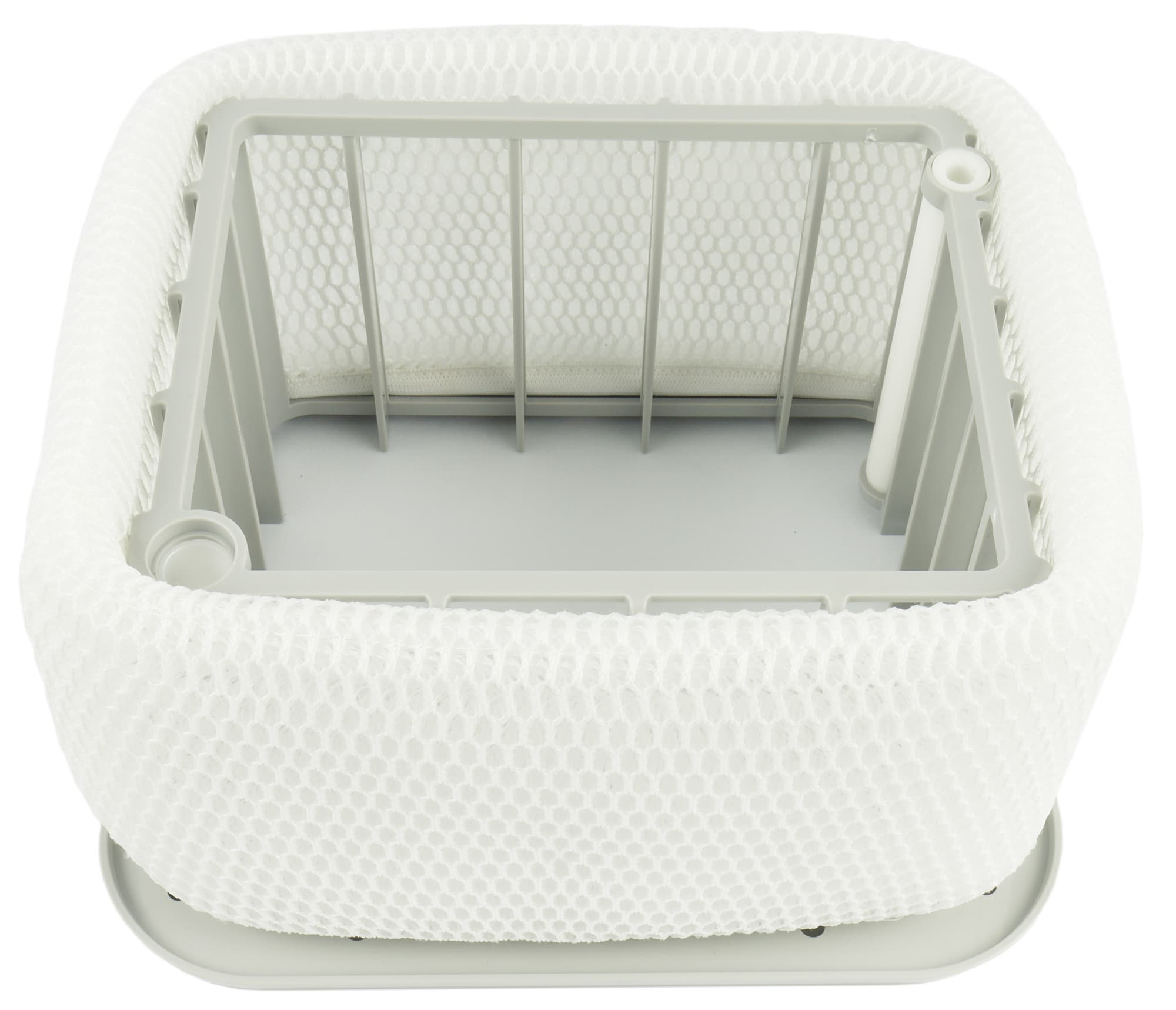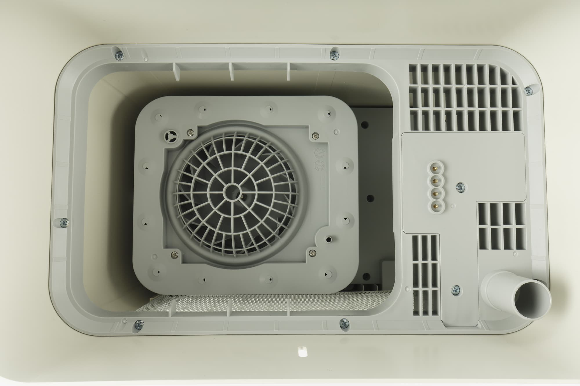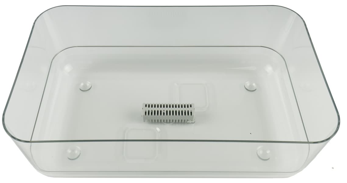 Главный рабочий элемент климатического комплекса — увлажнитель на крышке резервуара. Конструкция из синтетической сетки орошается водой, которую подает из емкости насос, а проходящий через нее воздух очищается и насыщается влагой.