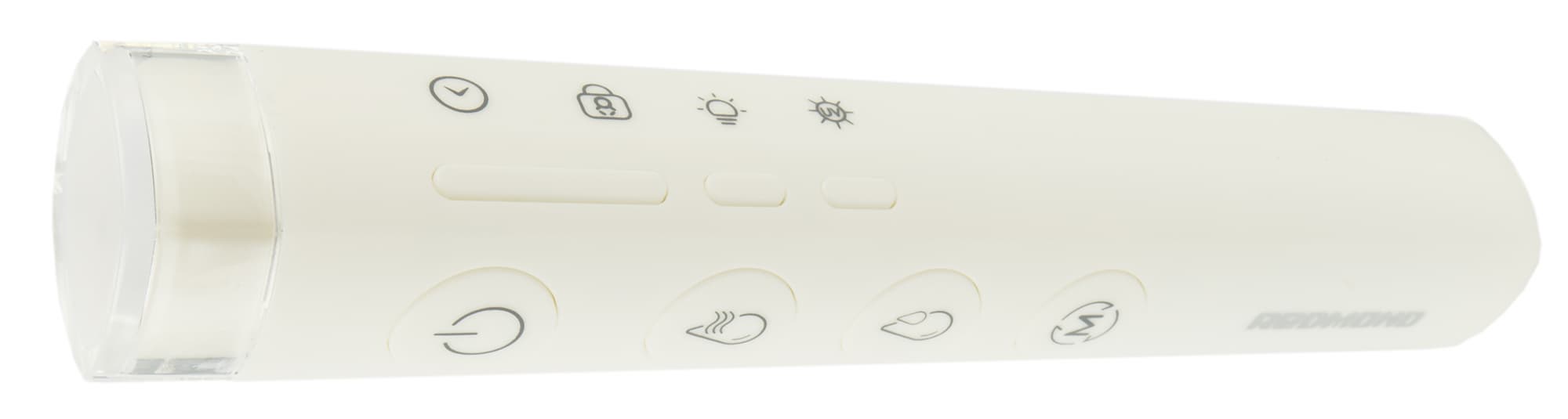 Инфракрасный пульт дистанционного управления выглядит весьма оригинально. На вытянутом белом параллелепипеде со скругленными гранями размещены семь кнопок, дублирующих соответствующие сенсоры на панели управления.