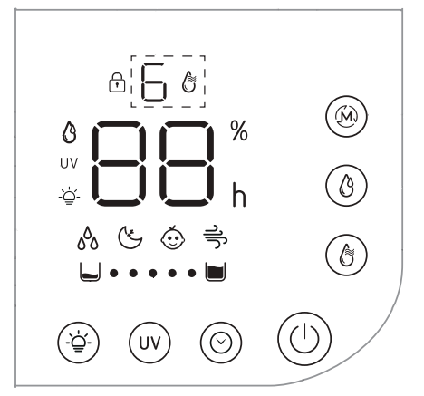 В верхней части дисплея цифрами от 1 до 6 отображается текущий уровень интенсивности увлажнения. Крупные цифры в центре экрана обозначают текущий или установленный уровень целевой влажности, а также время автоотключения в часах. Слева от цифр при включении соответствующих функций зажигаются символы целевой влажности, УФ-облучения и подсветки. Символы выбранного автоматического режима расположены под цифрами. В нижнем ряду размещен индикатор уровня воды в резервуаре.