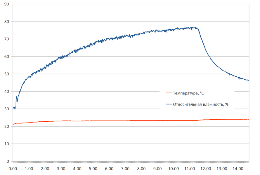 Стартовав в помещении c влажностью около 32%, прибор проработал до опустошения бака 11,5 часов. Влажность в помещении при этом медленно росла, достигнув к концу теста вполне неплохих 76%.
