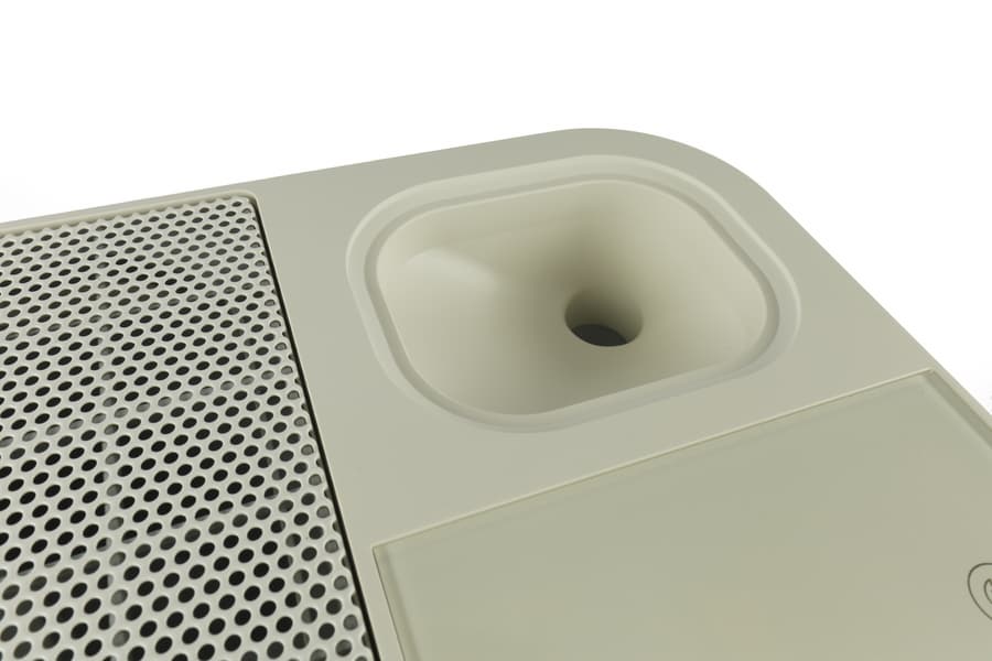 Она закрыта крышкой с логотипом производителя, под которой находится воронка: через нее вода попадает в резервуар увлажнителя.