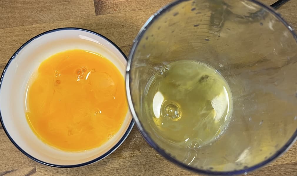 Далее мы взялись за испытание классического венчика и для этого разделили 3 яйца на белки и желтки.
