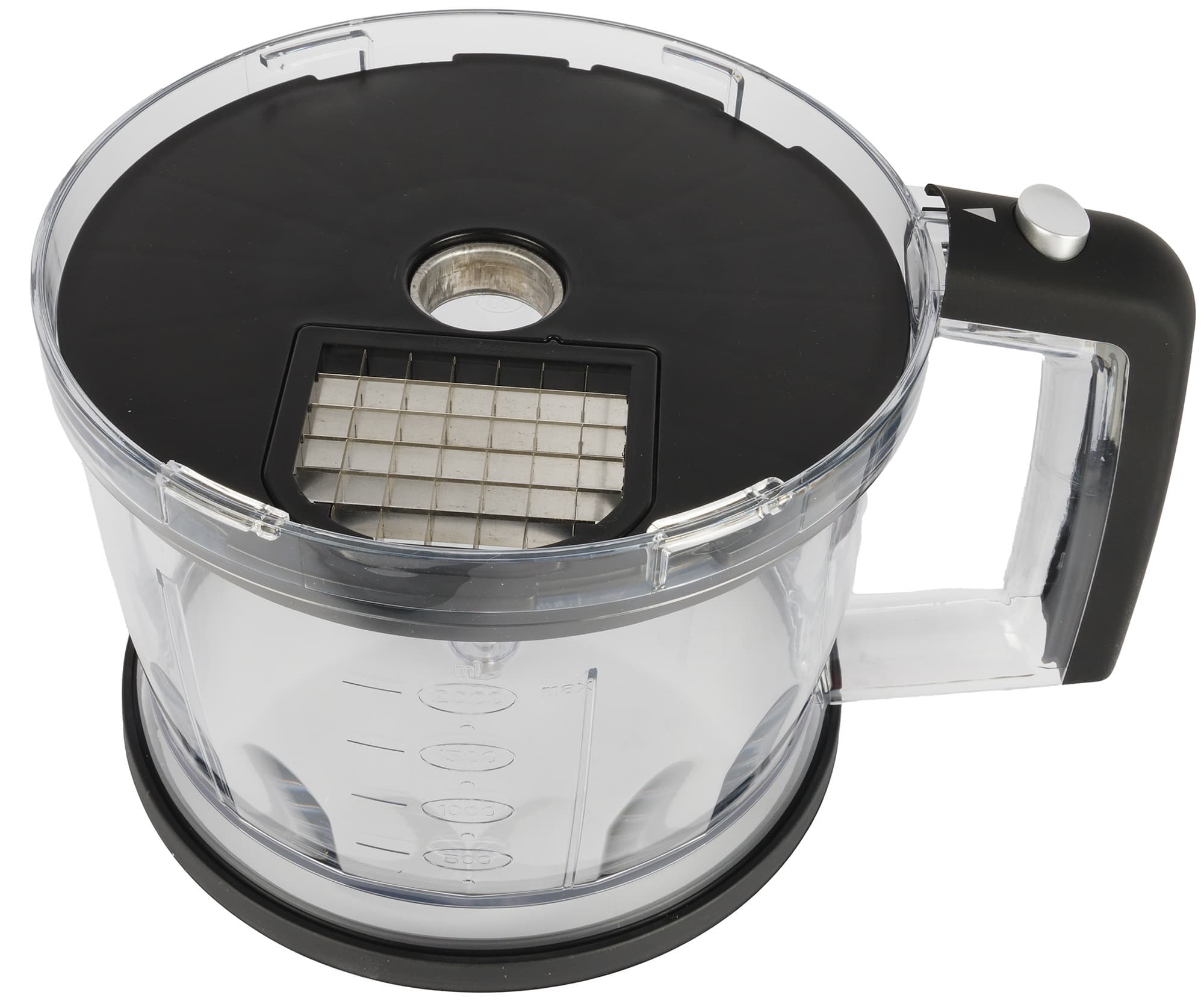 Малая чаша измельчителя объемом 500 мл выглядит классически: емкость, суженная к низу с рисками (миллилитры и унции) с двух сторон, внутри посередине штырь для установки s-образного ножа и крышка с возвышением для присоединения моторного блока.