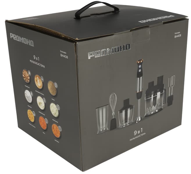 Блендер поступил к нам в картонной коробке средних размеров, оформленной в фирменной стилистике Redmond. Упаковка с удобной ручкой для переноски содержит подробную информацию об особенностях и технических характеристиках блендера, а также данные производителя и фотографии как самого устройства и всех его многочисленных насадок, так и примеров готовых блюд/продуктов при использовании каждой из насадок.
