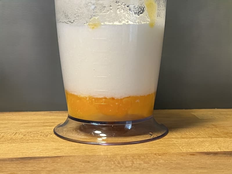 Погружная насадка сработала чисто: брызг не было, продукты не застревали. Мерный стакан отлично держится на рабочей поверхности, если его резиновую крышку подставить снизу. Венчик также справился со своей задачей без труда.