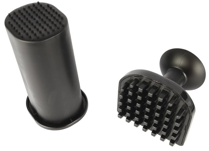 Для того чтобы по завершении процесса протолкнуть остатки продуктов из ячеек режущей решетки, в комплекте есть специальное пластиковое приспособление. Также на фото ниже можно увидеть пластиковый толкатель для загрузочной горловины.