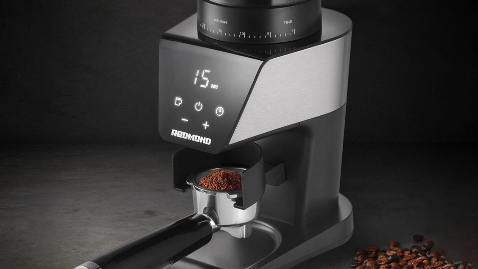 Черная пластиковая панель управления оборудована сенсорными кнопками со светодиодной подсветкой. Обозначения на сенсорах не видны на выключенной или перешедшей в режим ожидания кофемолке и проявляются только при прикосновении.