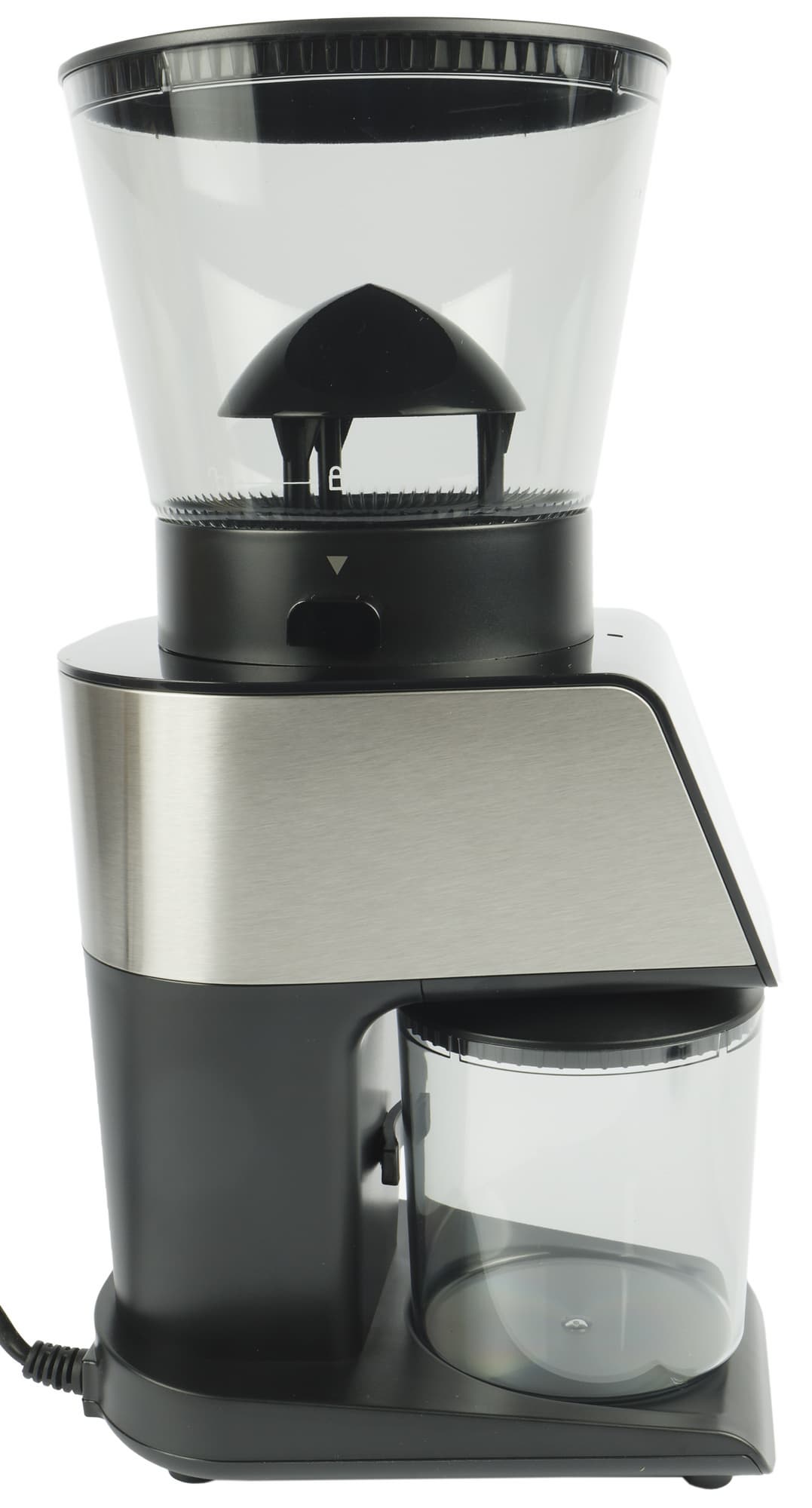 Компоновка у устройства традиционная: в верхней части находится бункер, рассчитанный на 390 граммов кофе. Из него зерна попадают на конические жернова, где перемалываются и уже в виде порошка попадают в подставленную спереди емкость.