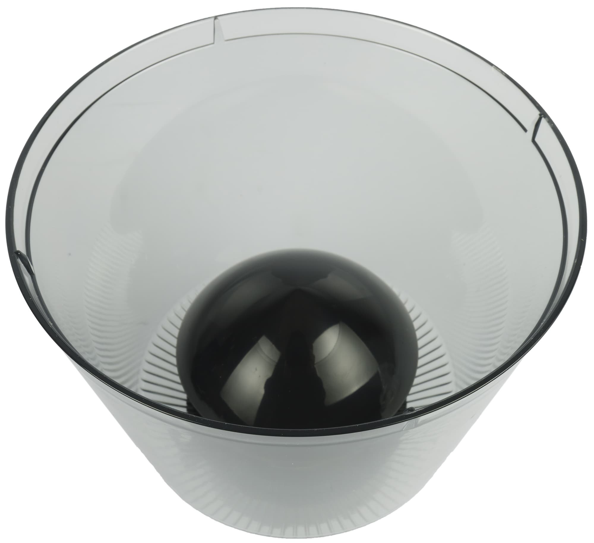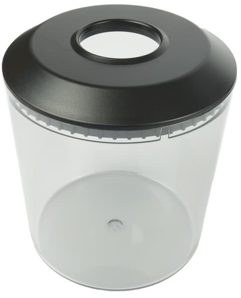 Контейнер для молотого кофе выполнен из прозрачного слегка затемненного пластика. Крышка пластиковая, с отверстием по центру. Пробки не предусмотрено, а следовательно — долго хранить молотый кофе в контейнере не получится: если собираетесь намолоть зерен с запасом, придется воспользоваться другой емкостью.