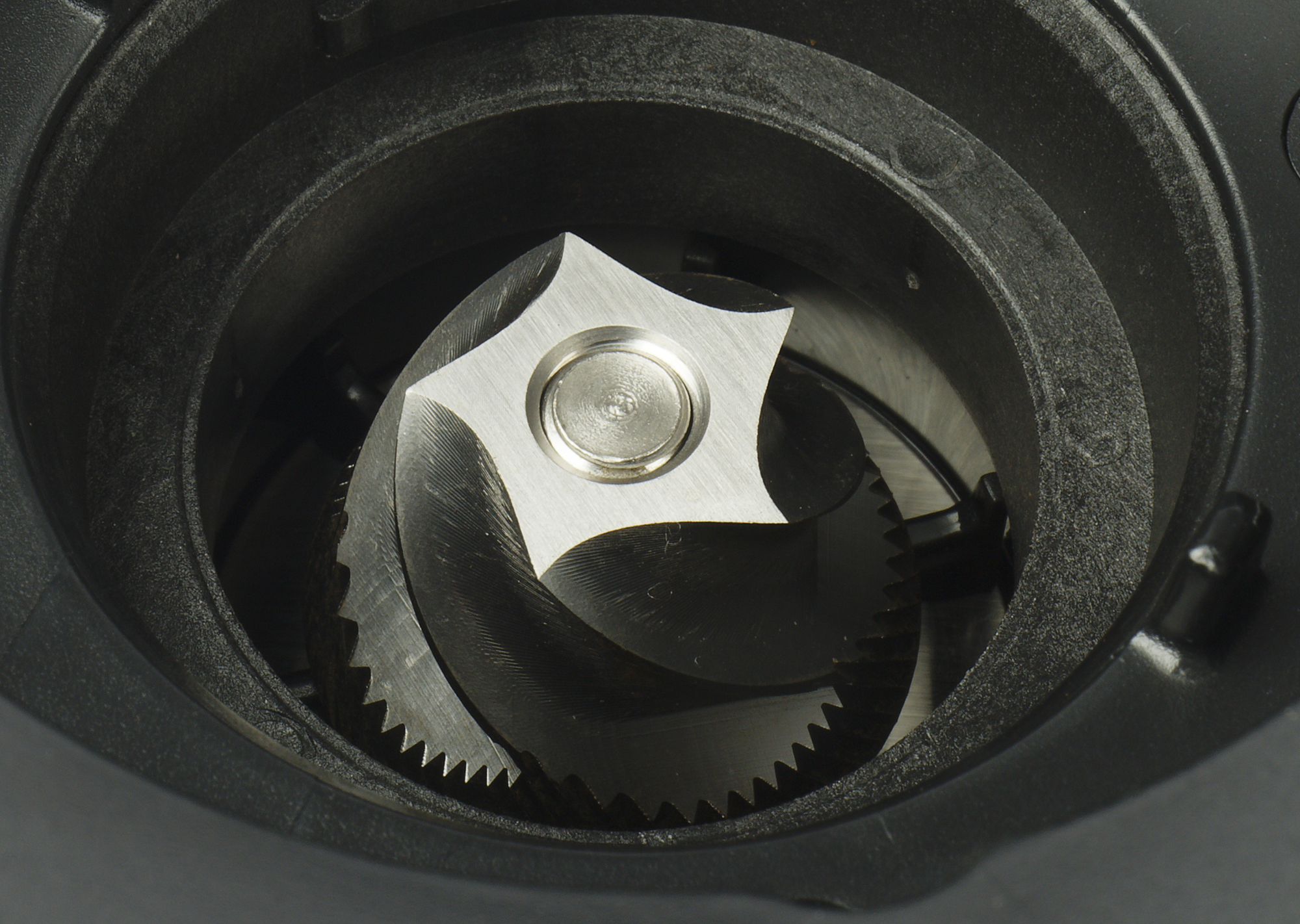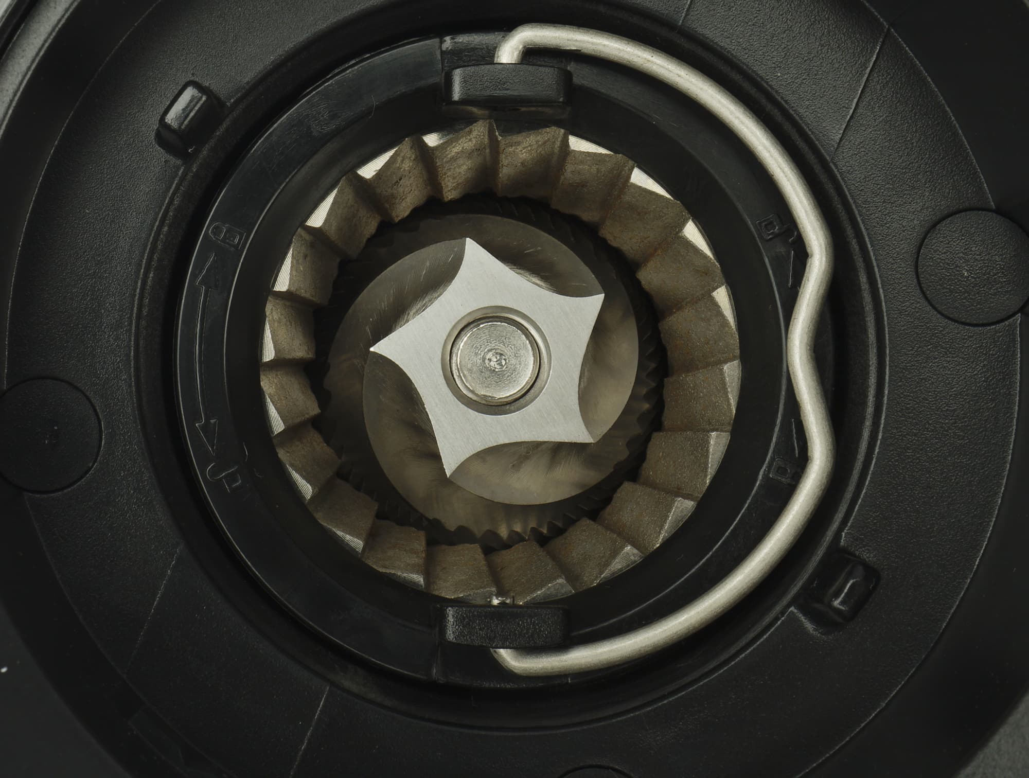 Внутренний конус при нормальной эксплуатации не снимается. Для этого даже не предусмотрено специального винта, так что если в жерновах что-то застрянет, то у нас могут возникнуть сложности с извлечением инородного предмета. Впрочем, ситуация эта нештатная, и случается редко (в идеале — вообще никогда).