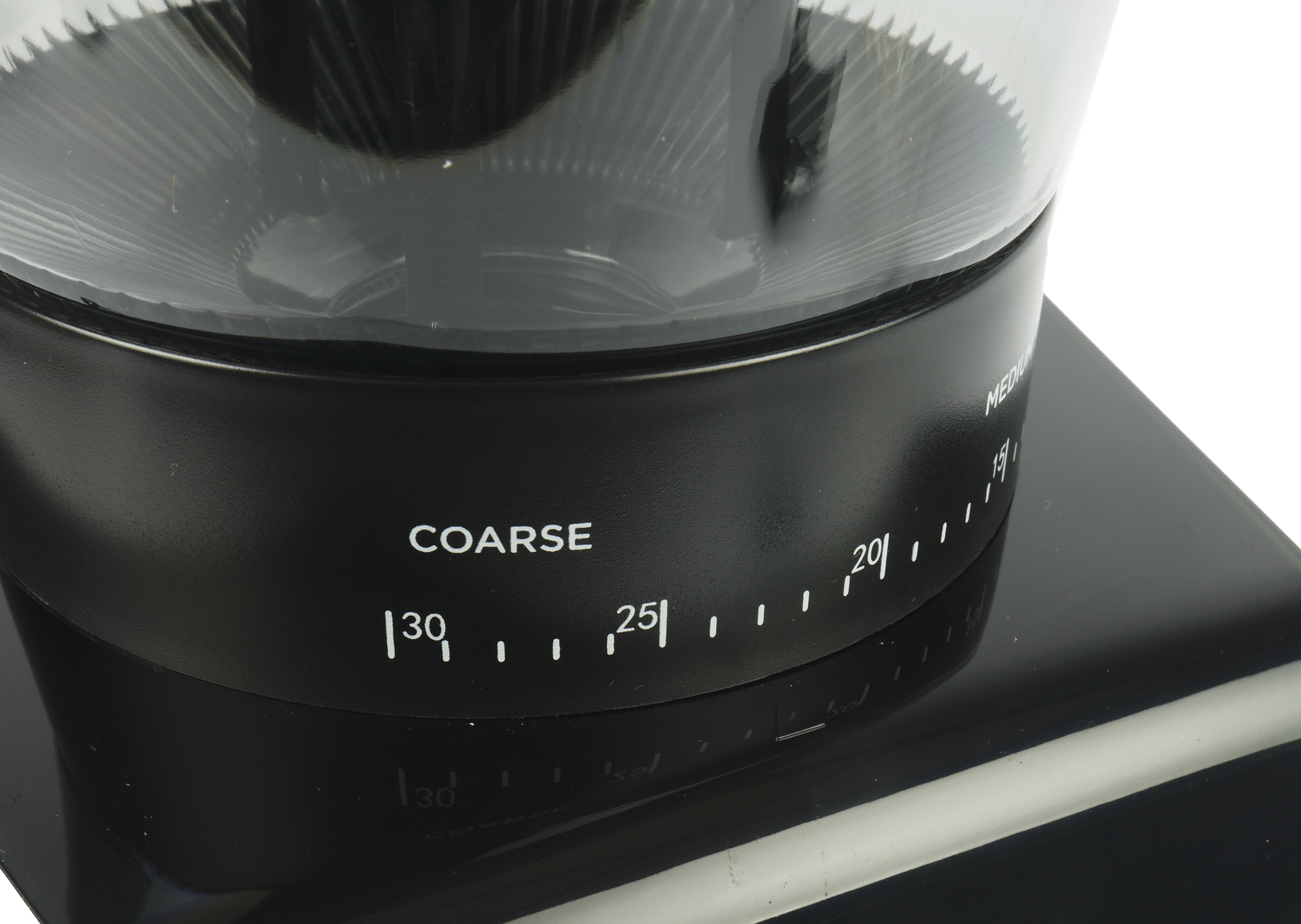 Сразу упомянем регулировку помола. Она осуществляется путем поворота резервуара на соответствующий угол. Всего предусмотрено 30 степеней помола. Переключение пошаговое, так что промежуточных значений выставить не получится. Надписи Coarse, Medium и Fine подскажут, что значение «30» относится к самому крупному помолу, а «0» — к самому мелкому.