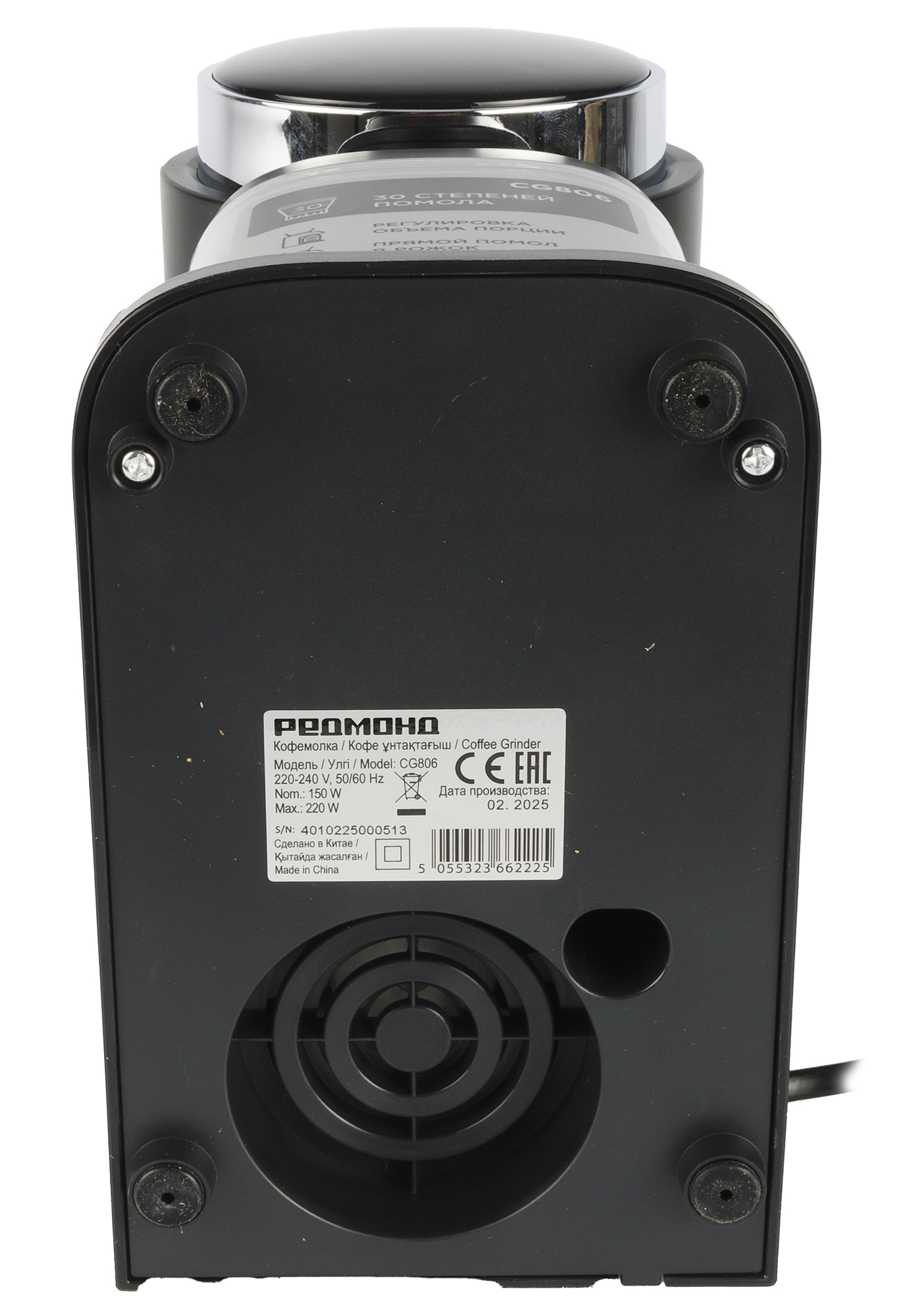 Кофемолка опирается на четыре резиновые ножки, препятствующие скольжению по гладкой поверхности.