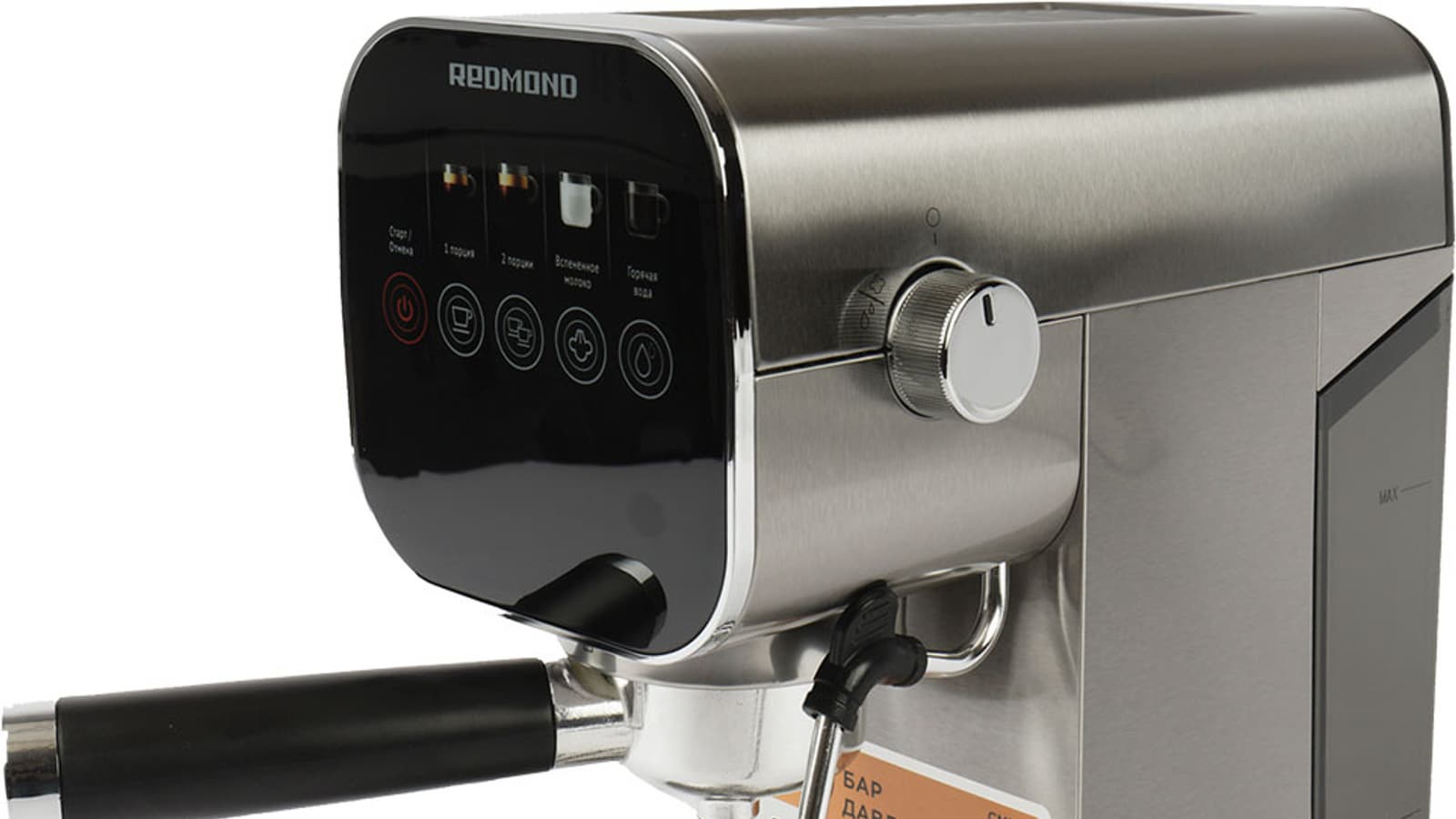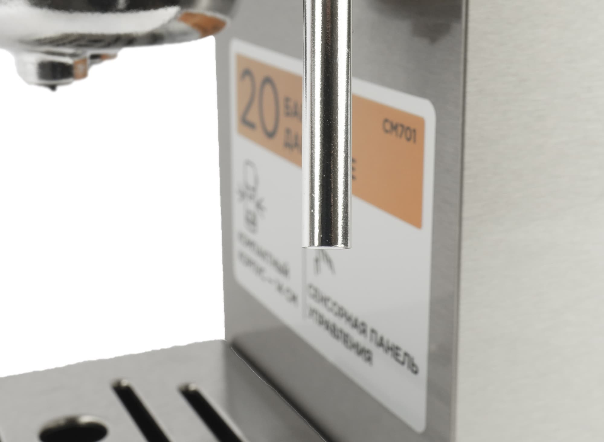 Над рожком капучинатора находится пластиковая ручка подачи пара, у которой имеется два рабочих положения (вкл. и выкл.). Рядом с ручкой на корпусе нанесены поясняющие иконки-пиктограммы.