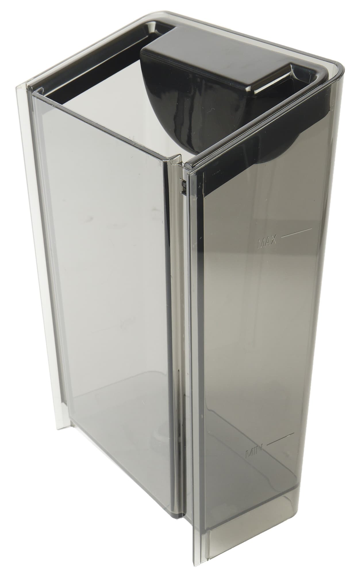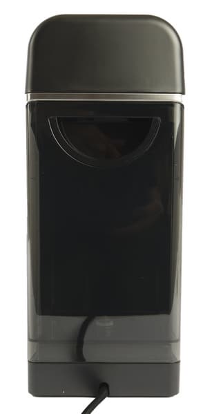 Контейнер сделан из прозрачного затемненного пластика. Объем относительно небольшой, но и не самый маленький — 900 мл. По бокам можно увидеть отметки Min и Max, соответствующие допустимому минимуму и максимуму воды. В корпусе прибора контейнер фиксируется под небольшим углом, с легким щелчком. В первые несколько раз к правильной установке контейнера придется привыкнуть. Для удобства извлечения и установки сзади предусмотрена утопленная ручка.