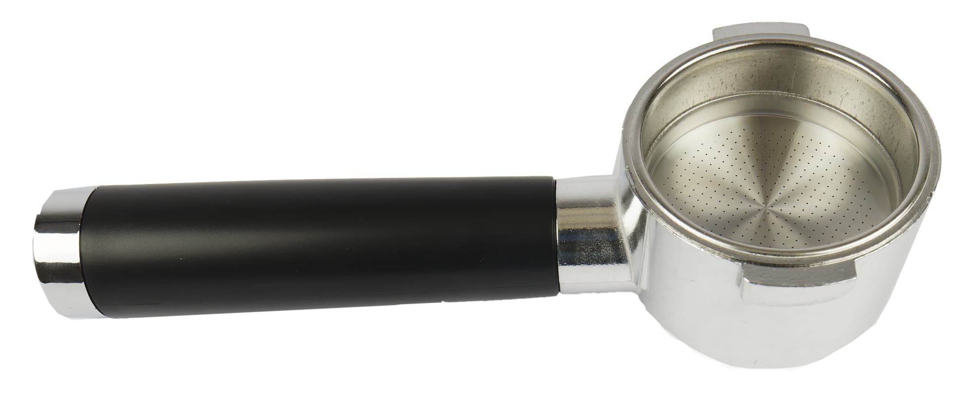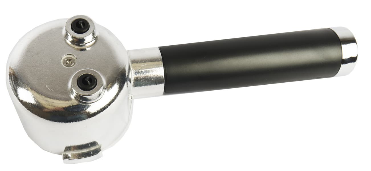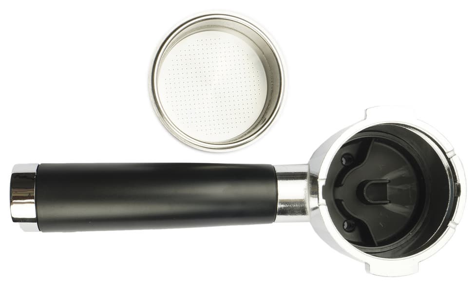 Рожок диаметром 51-52 мм имеет пластиковую ручку. Основной материал рожка — легкий белый металл (силумин?). Ручка пластиковая, насадка на ручку также пластиковая, окрашенная под металл. Выглядит рожок неплохо, но далеко не элитно. Что, впрочем, является обычным делом для бюджетных кофеварок.