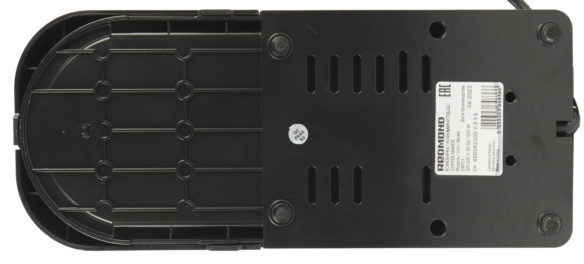 Снизу у кофеварки можно обнаружить резиновые ножки и наклейку с номером модели и технической информацией. Также снизу расположены вентиляционные отверстия, а вот отсека для хранения шнура не предусмотрено: не слишком длинный шнур просто просто выведен с тыльной стороны прибора.