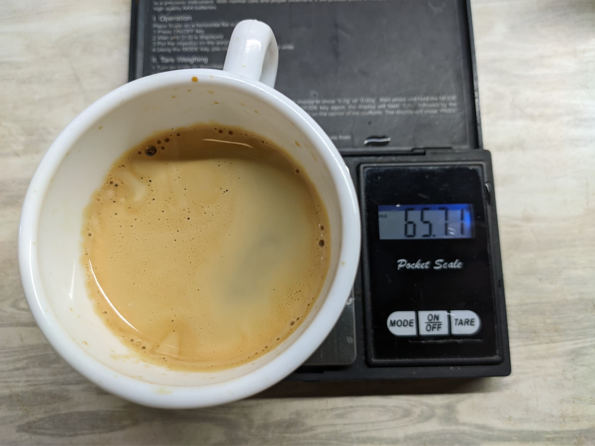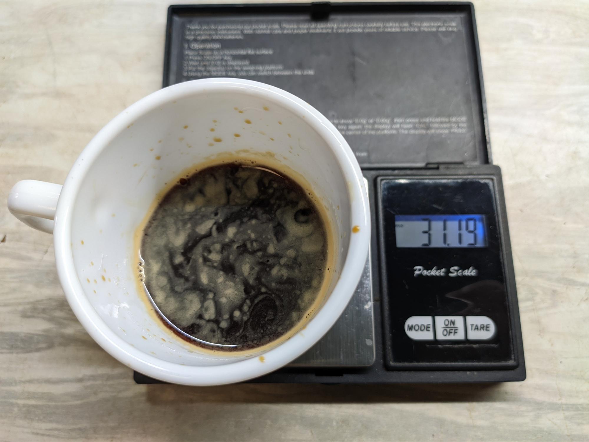 Двойной эспрессо готовится 38 секунд (включая предсмачивание), вес готового напитка составил 65 граммов, а температура готового напитка 69 °C (гораздо лучше, чем при приготовлении одинарной порции).