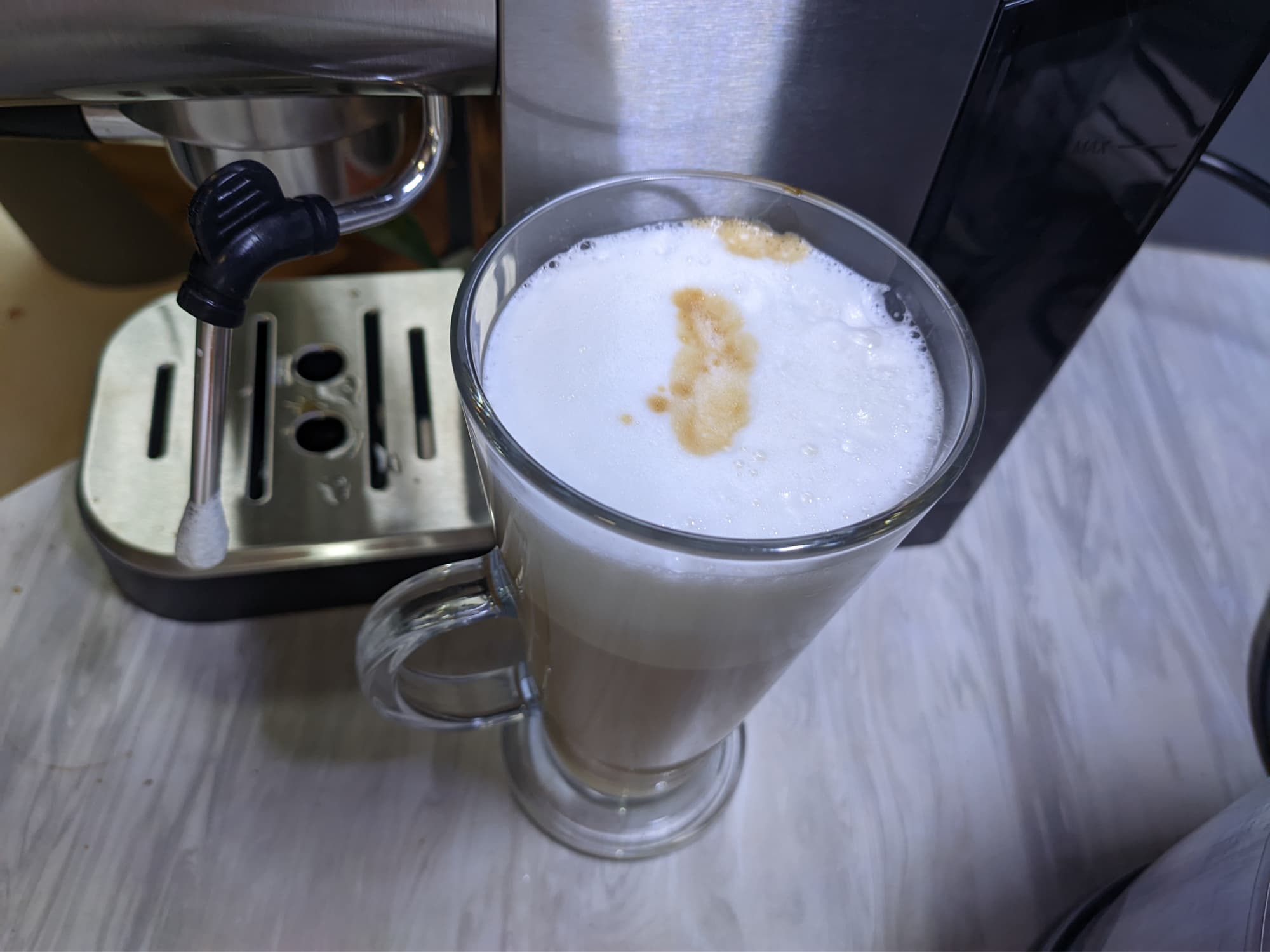 Пар подается равномерно и довольно интенсивно. В результате не обошлось и без крупных пузырьков, которые, впрочем, почти все исчезли после того, как мы постучали питчером по рабочей поверхности.