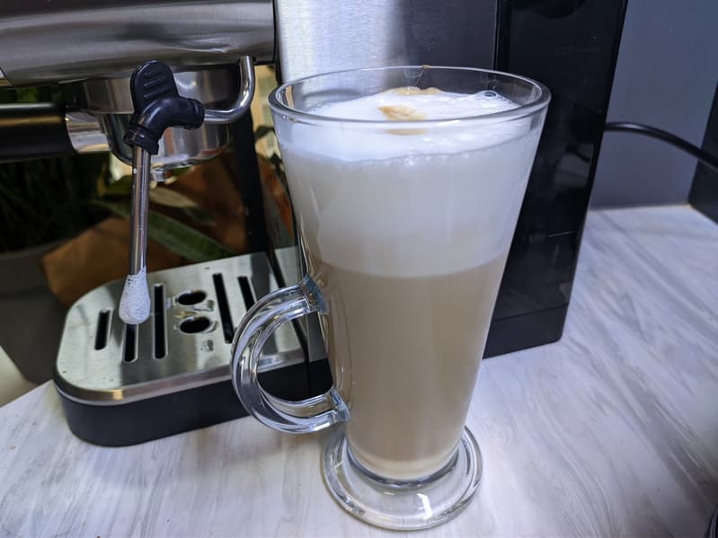 А вот вид сверху. Как мы видим, молочная пена получилась не идеальная, но вполне приличная. При этом есть куда стремиться. Если набить руку и приноровиться к скорости подачи пара, то и качество пены окажется выше.