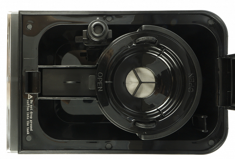 Пространство вокруг заварочного блока занято резервуаром для воды. Его вместимость (0,8 литра) соответствует объему кувшина для кофе. Отметка максимального уровня размещена на трубке, через которую в крышку подается горячая вода. Датчика уровня жидкости в резервуаре нет: устройство не защищено от включения без воды.