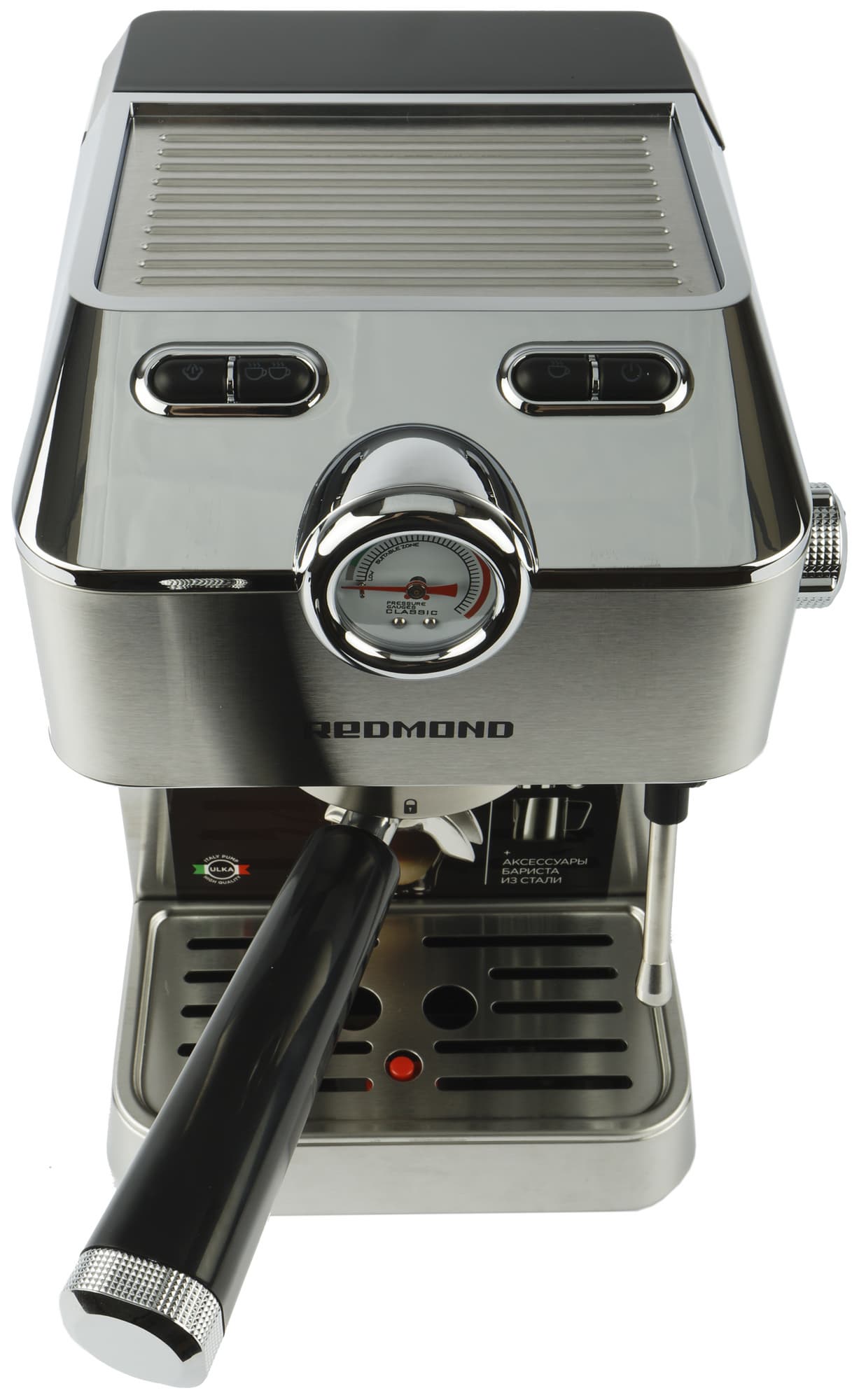Манометр, расположенный рядом с кнопками, поможет контролировать давление при заваривании кофе. Числовых значений тут не предусмотрено, поэтому ориентироваться придется лишь примерно. Для удобства пользователя на шкале нанесена специальная «зеленая зона», в которой должна находиться стрелка в случае, если процесс приготовления напитка идет как надо.