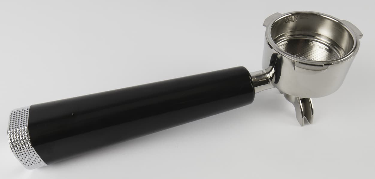 Рожок диаметром 51-52 мм имеет пластиковую ручку. Основной материал рожка — легкий белый металл (силумин?). Ручка пластиковая, насадка на ручку также пластиковая, окрашенная под металл. Выглядит рожок неплохо, но далеко не элитно. Что, впрочем, является обычным делом для бюджетных кофеварок.