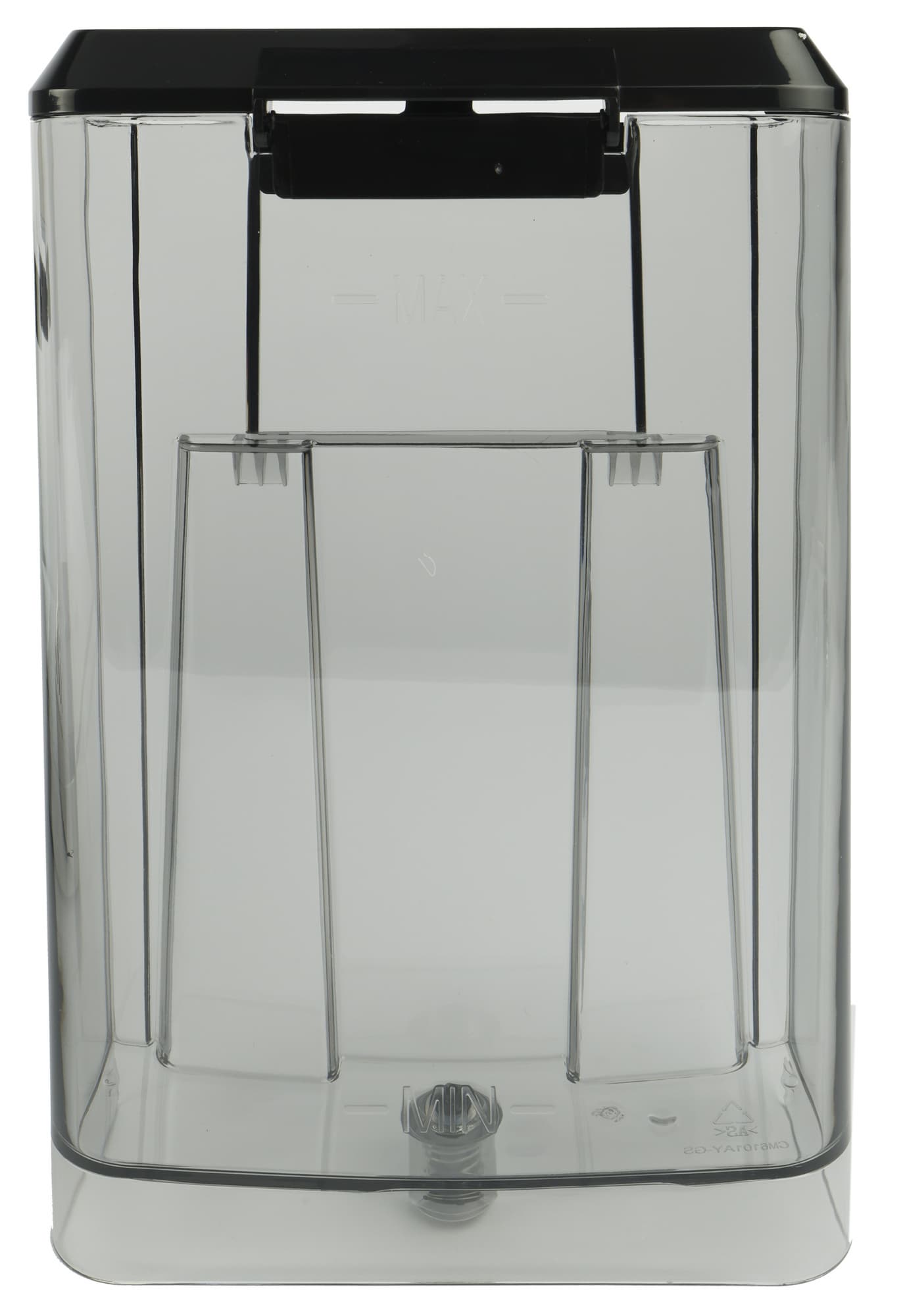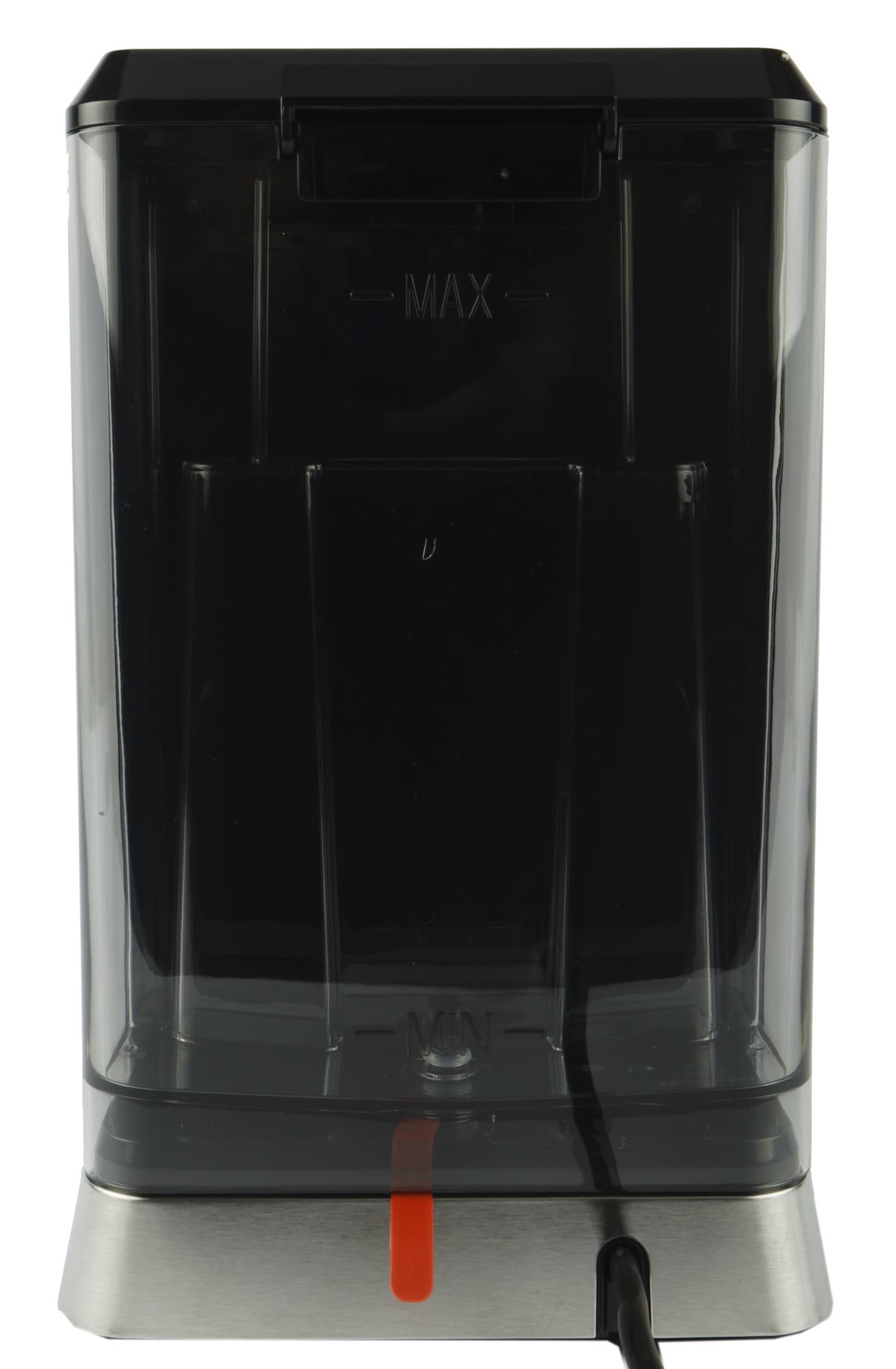 Контейнер для воды сделан из прозрачного затемненного пластика. Объем довольно большой — целых 1,5 литра, что предполагает активное использование и кофеварки, и капучинатора. Отметки Min и Max, соответствующие минимальному и максимальному уровню воды находится сзади, так что увидеть их получится лишь полностью сняв бак. Мы же, как водится, предпочитаем доливать воду сверху. Для этого у кофеварки предусмотрена откидная пластиковая крышка. В корпусе прибора контейнер фиксируется с легким щелчком. Специальной ручки или другого подобного механизма не предусмотрено.