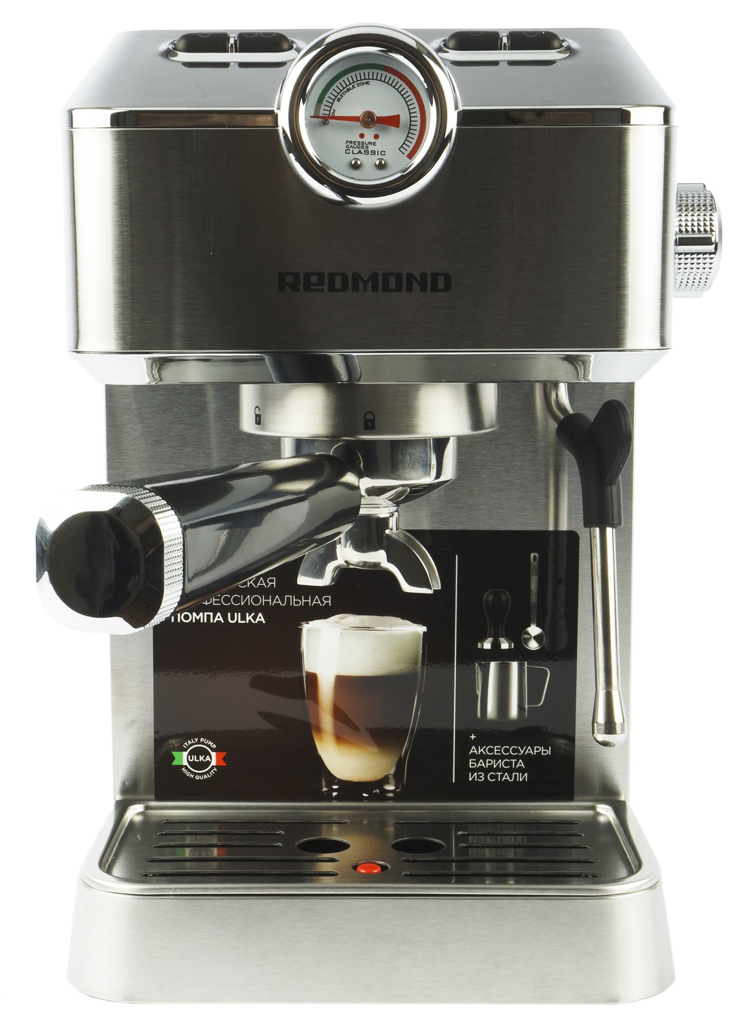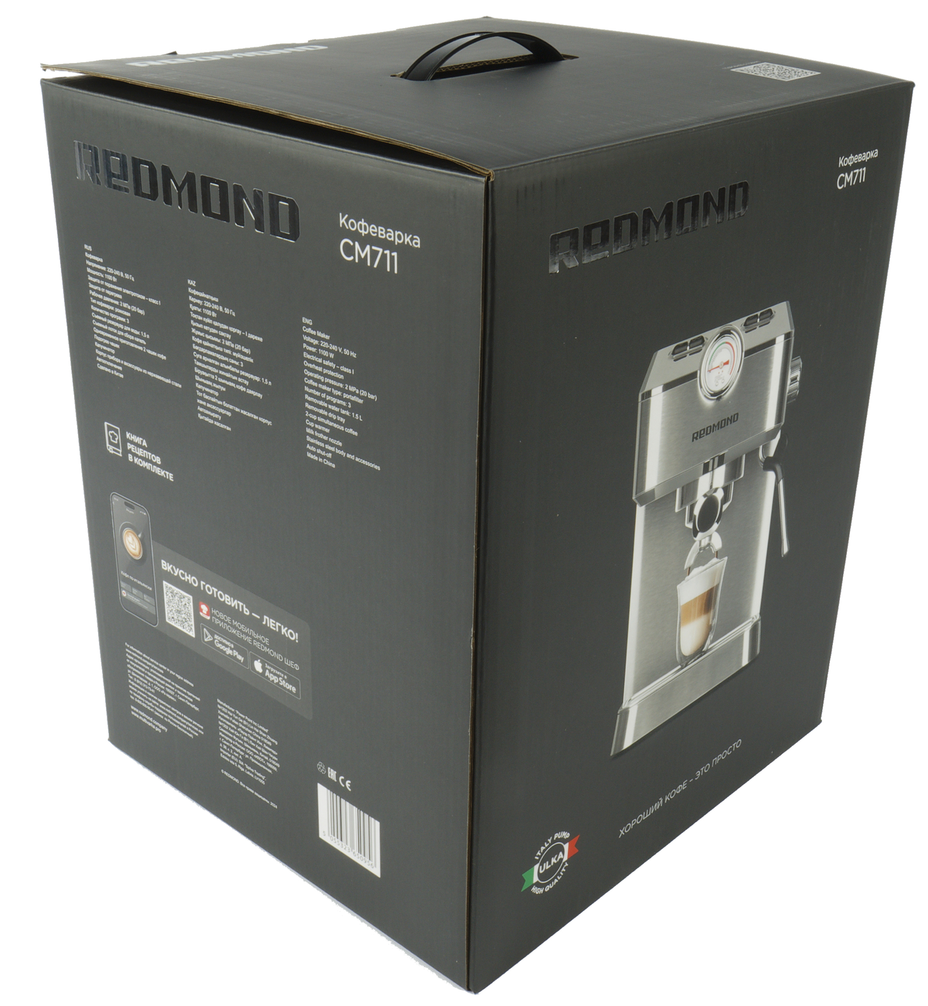Кофеварка поставляется в коробке, оформленной в строгом стиле Redmond. Такую коробку можно увидеть, скорее, на полке с полу-профессиональными кофеварками, а не в отделе рожков для дома.
