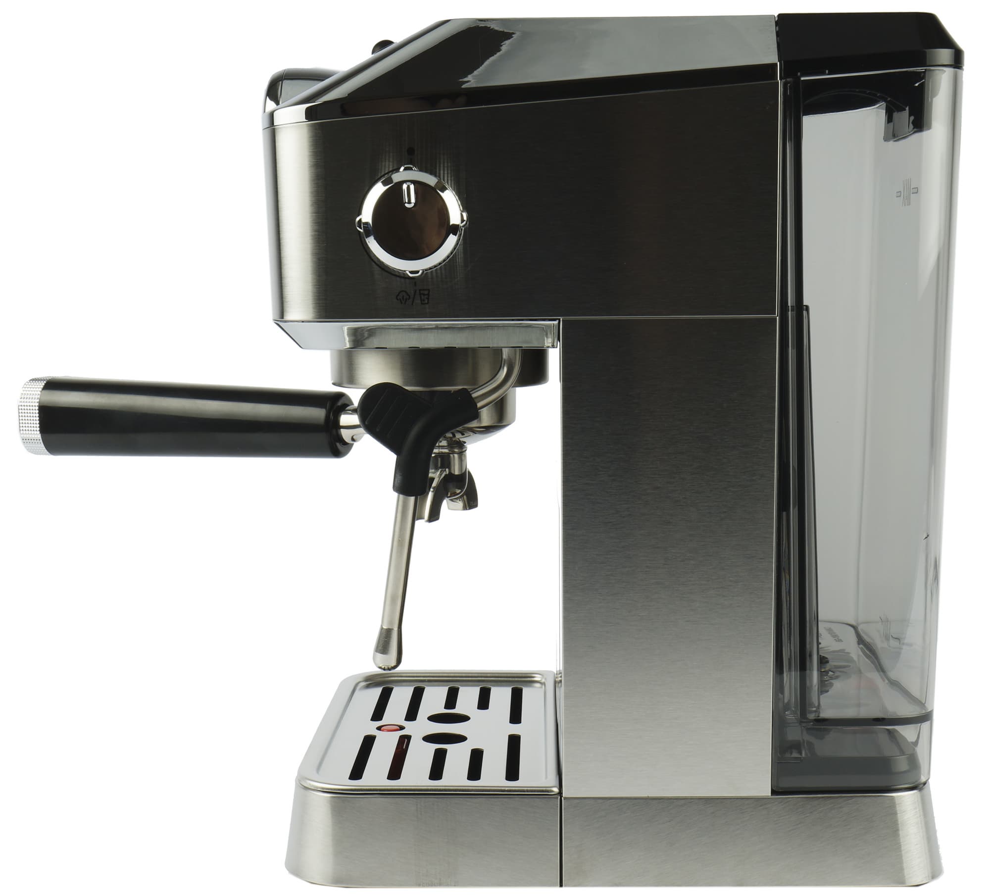 ...и тут нас поджидает приятный сюрприз: трубка капучинатора поворачивается не только вправо/влево, но также допускает регулировку наклона вверх/вниз. Это позволяет установить максимально комфортный угол для работы с питчером. Признаться, мы с ходу не можем вспомнить ни одной бюджетной кофеварки с такой функциональностью. Обычно возможность наклона трубки капучинатора присутствует лишь в профессиональных и полупрофессиональных моделях. Высота от рабочей поверхности до трубки капучинатора составляет не более 9 сантиметров, что накладывает некоторые ограничения на размер питчера (кувшина для взбивания молочной пены).