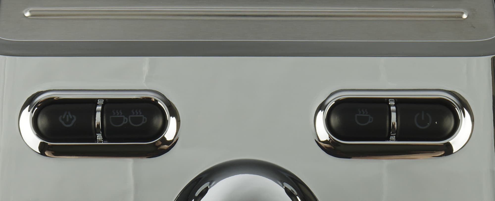 Панель управления кофеваркой состоит из четырех электромеханических кнопок с белой светодиодной подсветкой и вращающейся ручки капучинатора. Давайте рассмотрим все элементы и разберемся с их назначением.