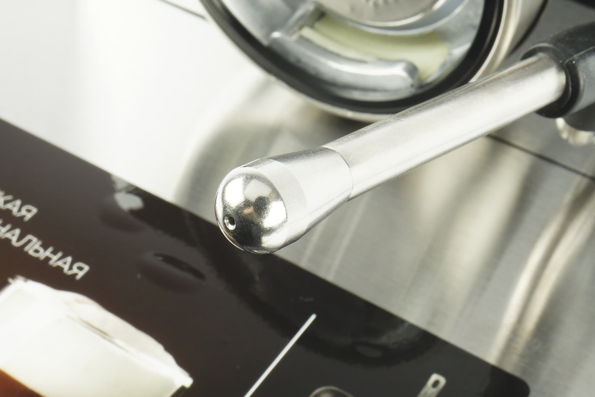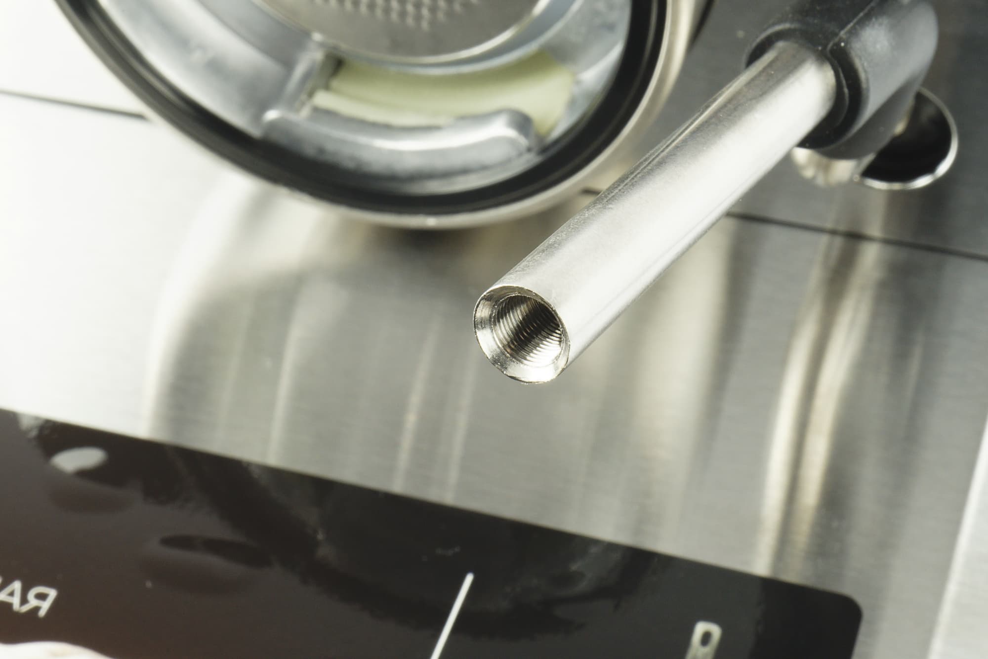 Справа у кофеварки расположена трубка капучинатора, оснащенная резиновым захватом (чтобы не обжечься) и съемной металлической насадкой-панарелло. Выглядит все прямо как у «взрослых» кофеварок. Если снять насадку, то мы увидим, что пар подается напрямую через металлическую трубку. Никаких дополнительных пластиковых трубочек внутри.
