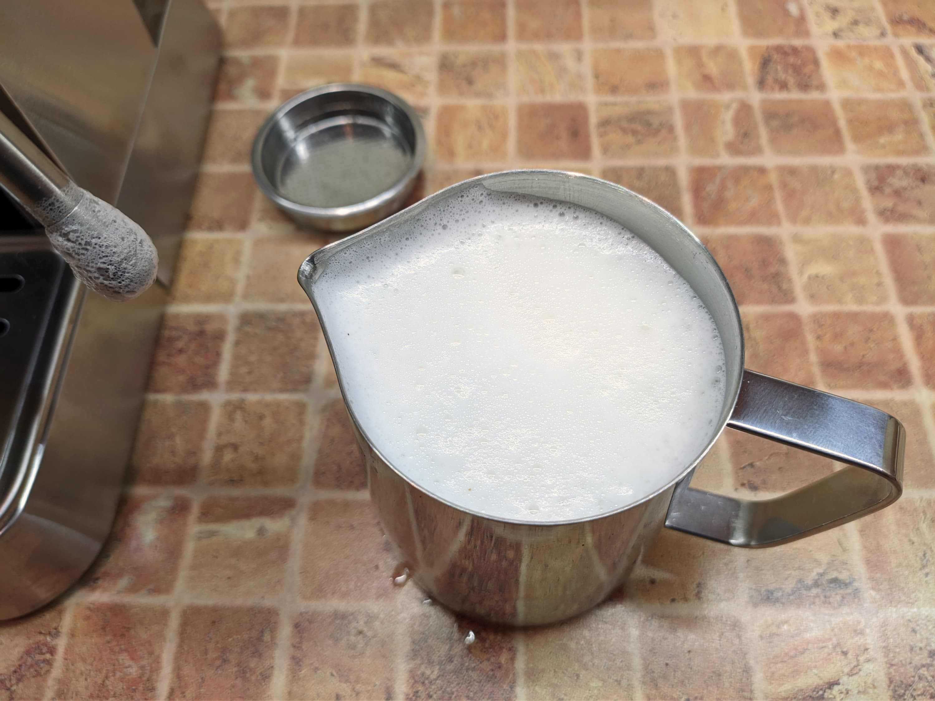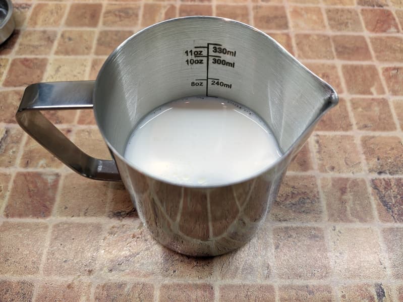 Что ж, теперь попробуем взбить молоко. Для этого мы взяли 200 мл молока из холодильника, поместили в питчер и включили подачу пара, предварительно слив из капучинатора небольшое количество воды и опустив сопло капучинатора в молоко, чтобы избежать ненужных брызг. На подготовку к подаче пара у кофеварки ушло 25 секунд.