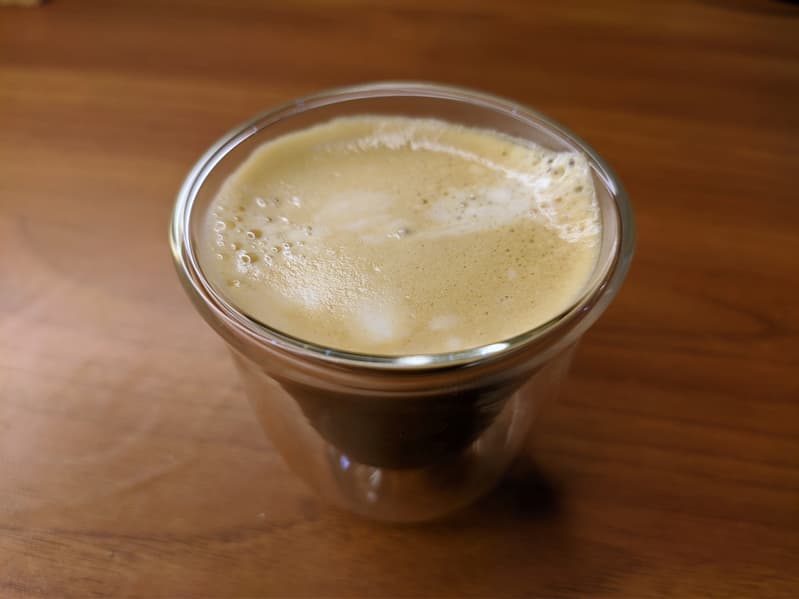Как мы видим, выглядит одинарный эспрессо неплохо. Тут даже есть пенка крема, хоть и не в очень большом объеме. Вкус мы при этом субъективно оцениваем как средний.