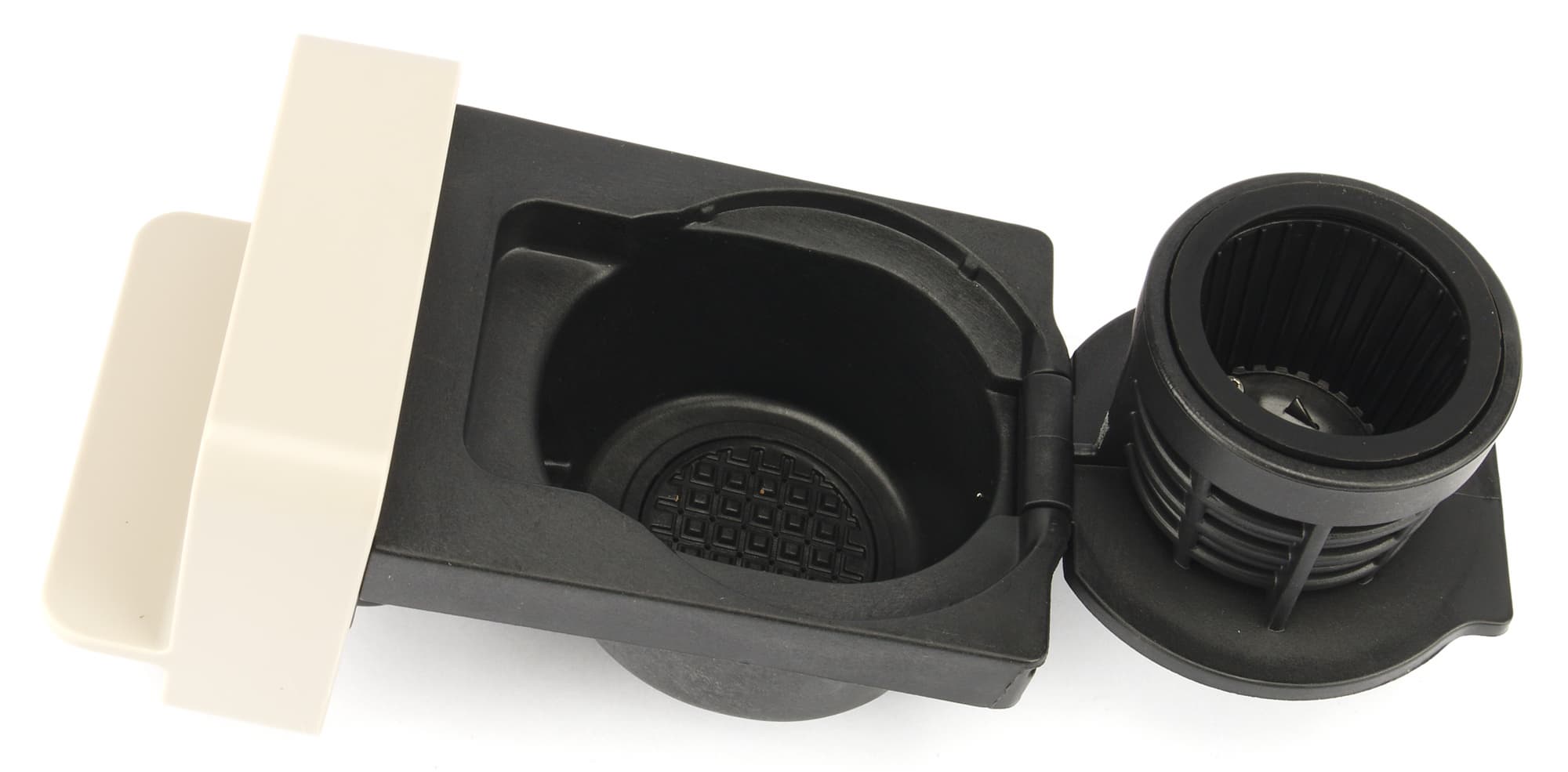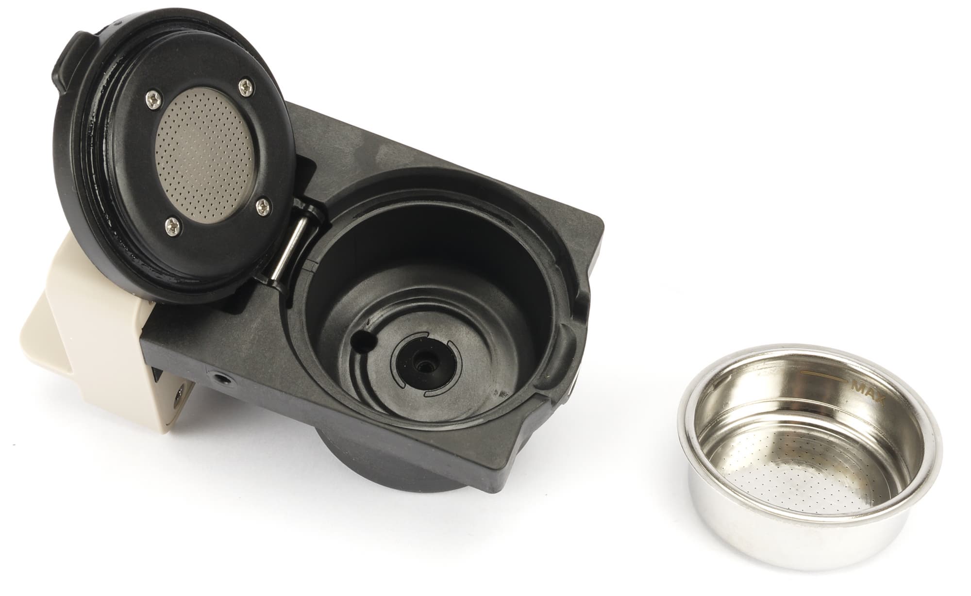 Адаптеры для различных типов кофе выполнены в едином форм-факторе, однако изнутри выглядят по-разному. Адаптер для Dolce Gusto (крайний справа) похож на простой пластиковый держатель, адаптер для молотого кофе (крайний слева) оснащен крышечкой и металлическим фильтром с двойным дном («улучшайзером») — точно таким же, какой можно встретить у многих бюджетных рожковых кофеварок. Адаптер для капсул Nespresso (посередине) имеет специальную крышечку с выступами для перфорации фольги.