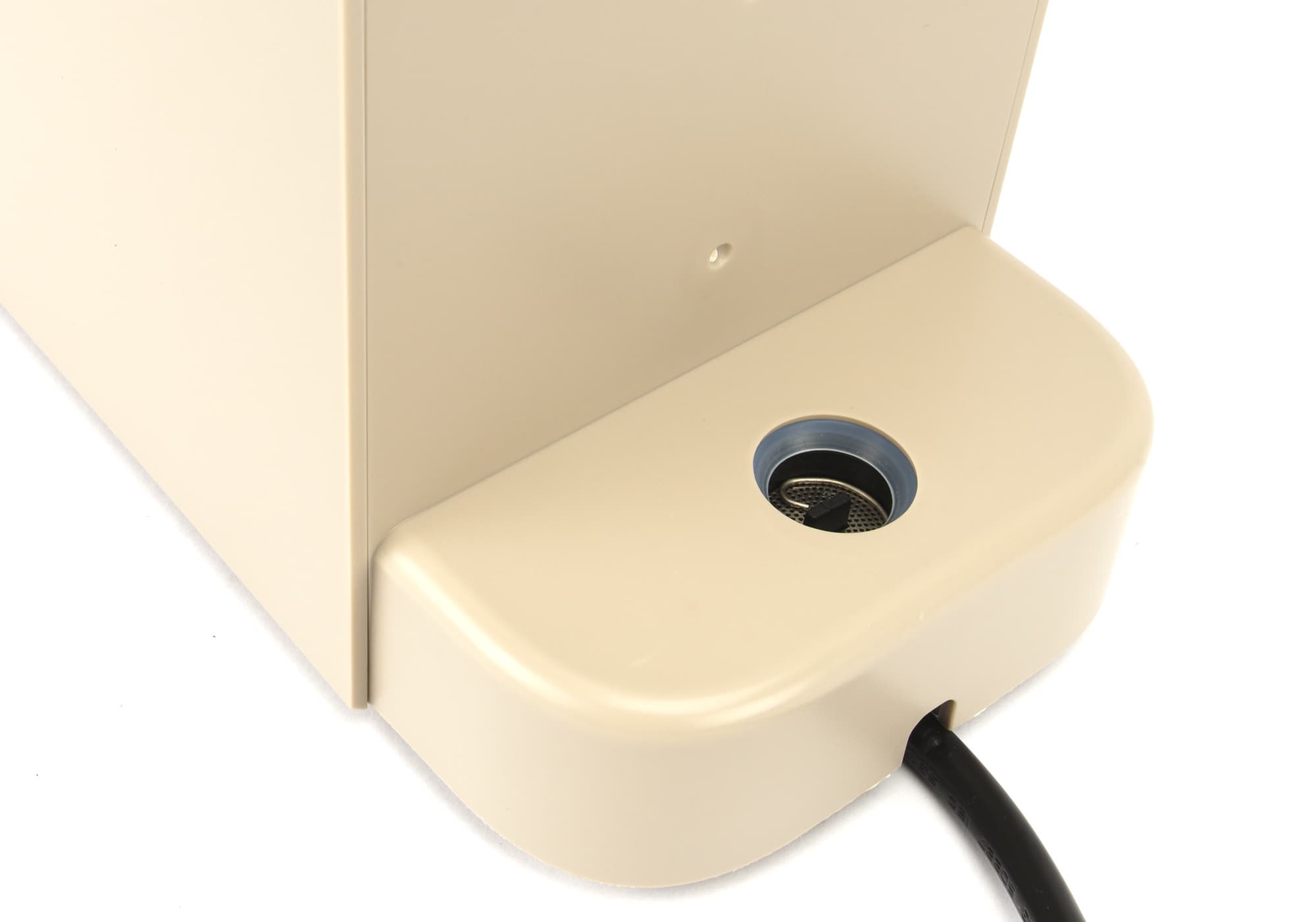 С тыльной стороны выходит шнур питания. Там же находится место для установки контейнера с водой. Подача воды в кофеварку осуществляется через клапан на дне, оснащенный простым фильтром-сеточкой.