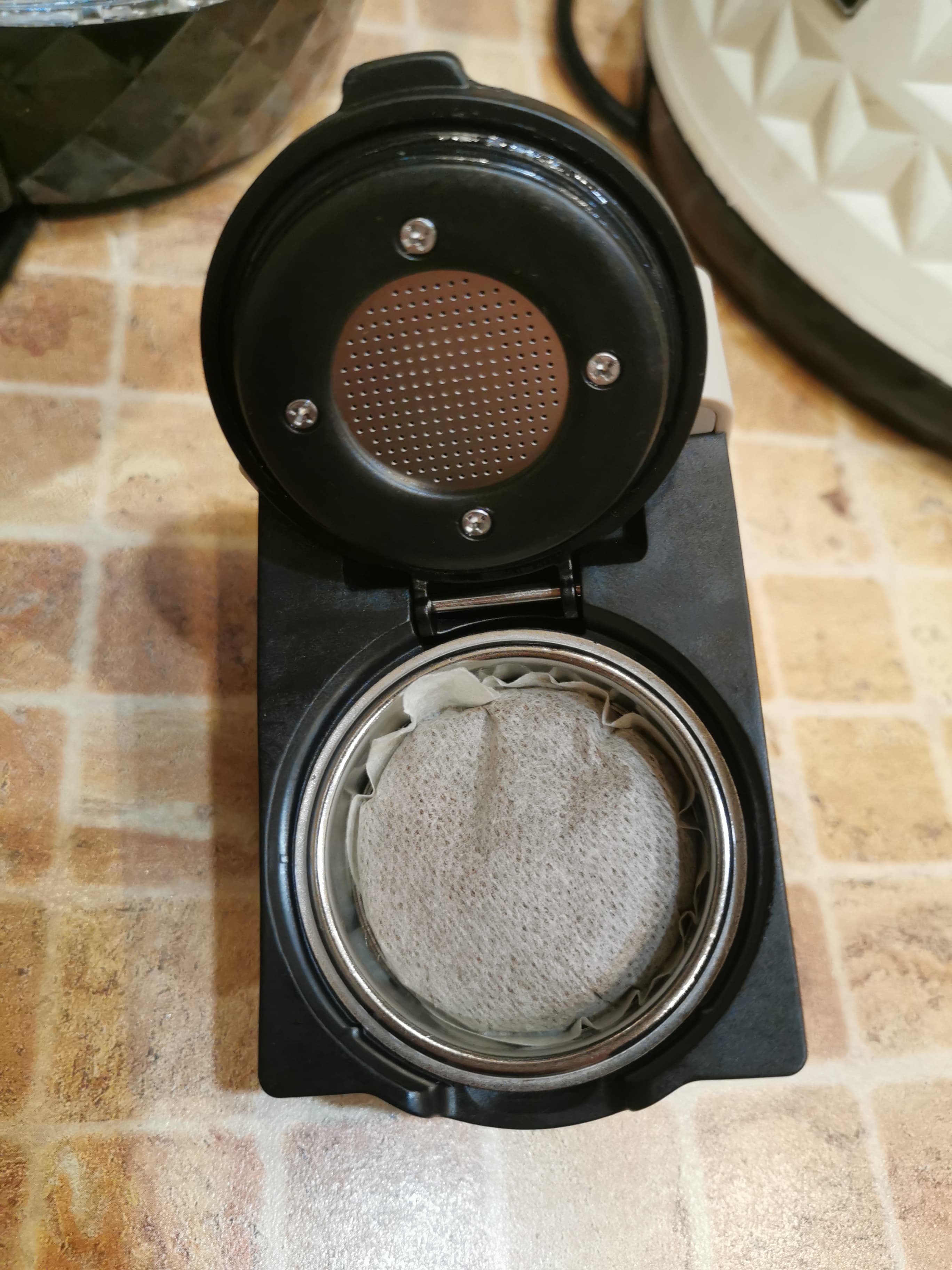 Мы поместили капсулу в переходник, крепко закрыли крышку руками, продавив тем самым фольгу, и поставили переходник в кофеварку.