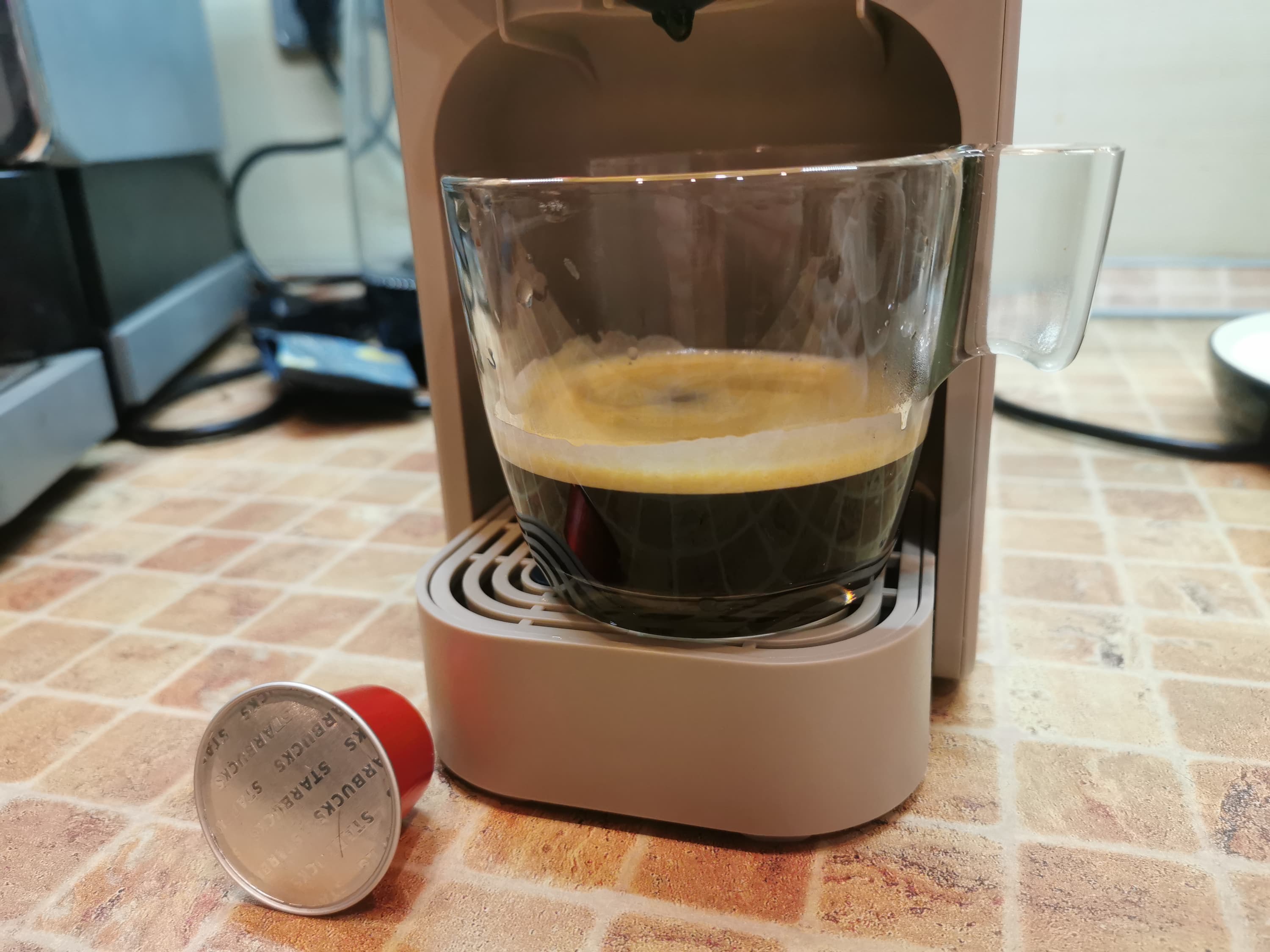 Наш первый тест — приготовление эспрессо с помощью капсулы Nespresso. Для этого режима мы воспользовались первой кнопкой.
