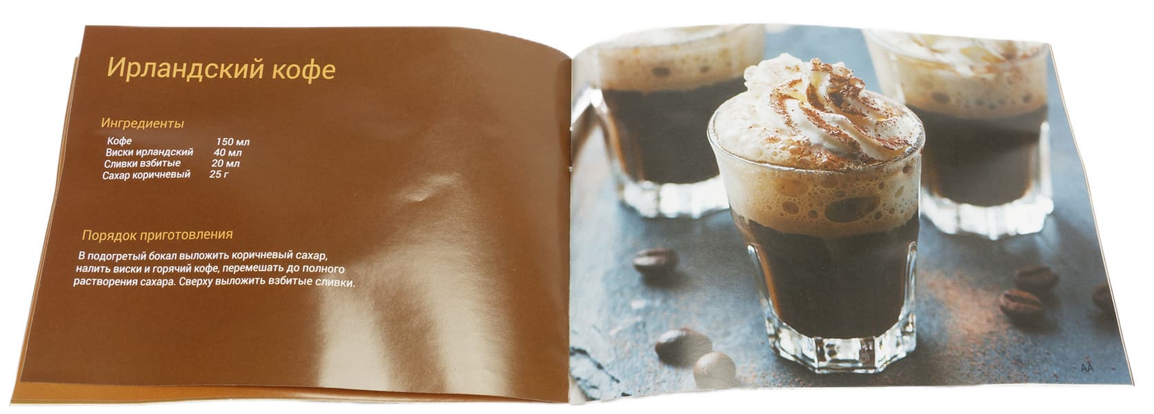 Кроме того, в комплект входит книга рецептов приготовления кофе. Рецепты, правда, преимущественно с добавлением алкоголя, а еще удивляет объем кофе, предлагаемого в рецептах: 150 мл, тогда как объем двойного эспрессо, который варит кофеварка — всего 77 мл. То есть для приготовления напитка из рецепта нужно как минимум дважды сварить кофе. Впрочем, есть и довольно интересные идеи, которыми при желании можно воспользоваться.