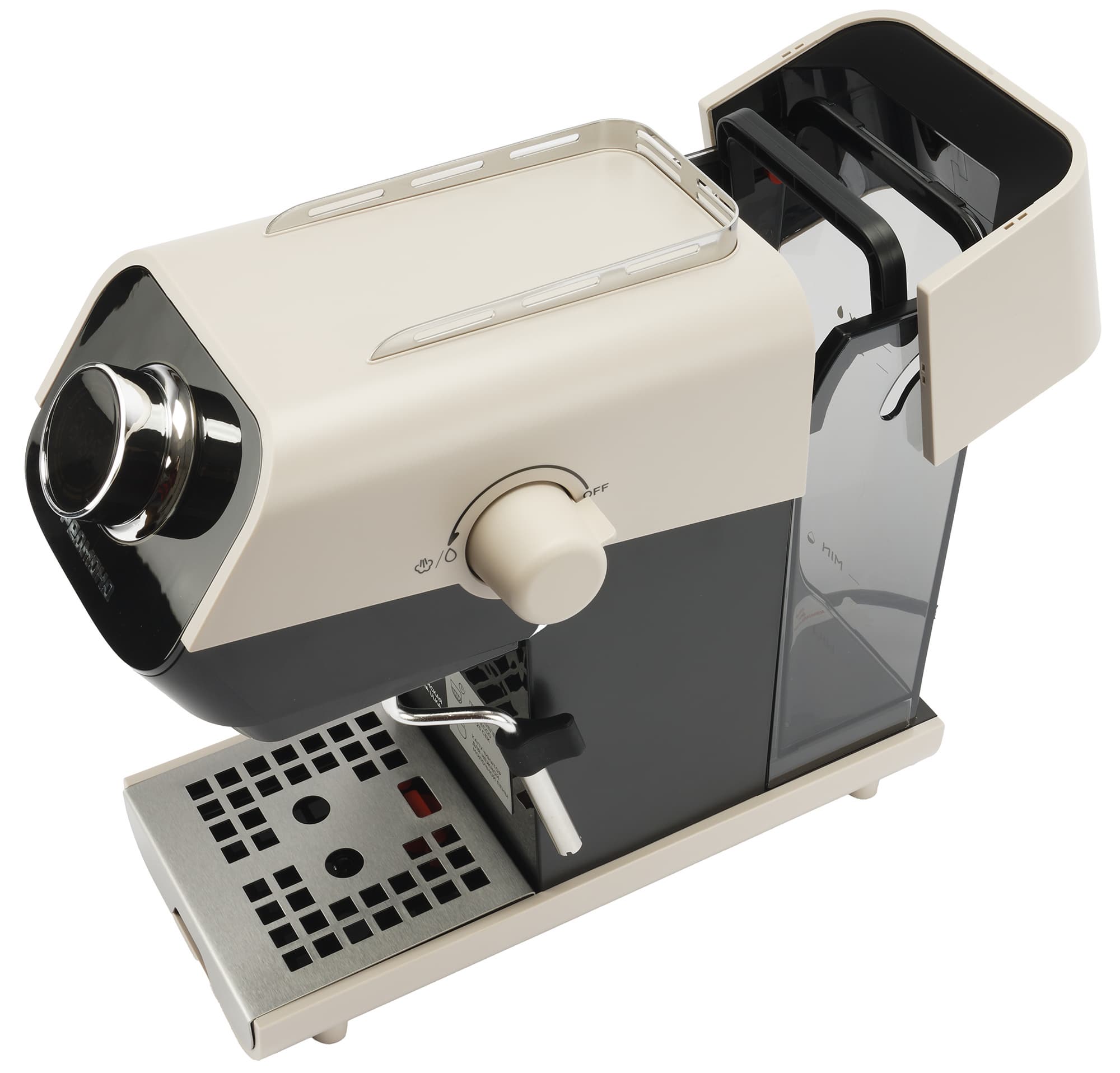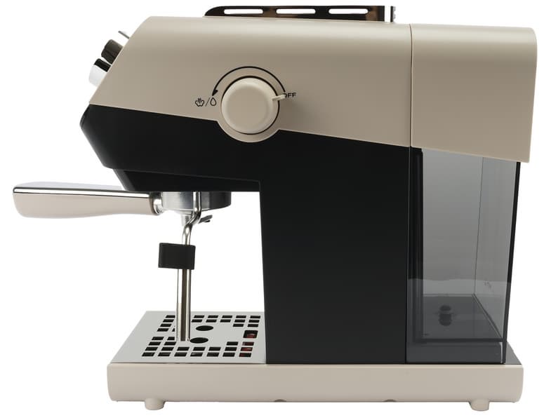 Кофеварка производит впечатление приятного, элегантного, а главное — небольшого прибора: стильный корпус, выполненный из бежевого и черного пластика, панель управления, расположенная на фронтальной части кофеварки и снабженная энкодером.