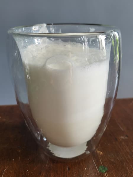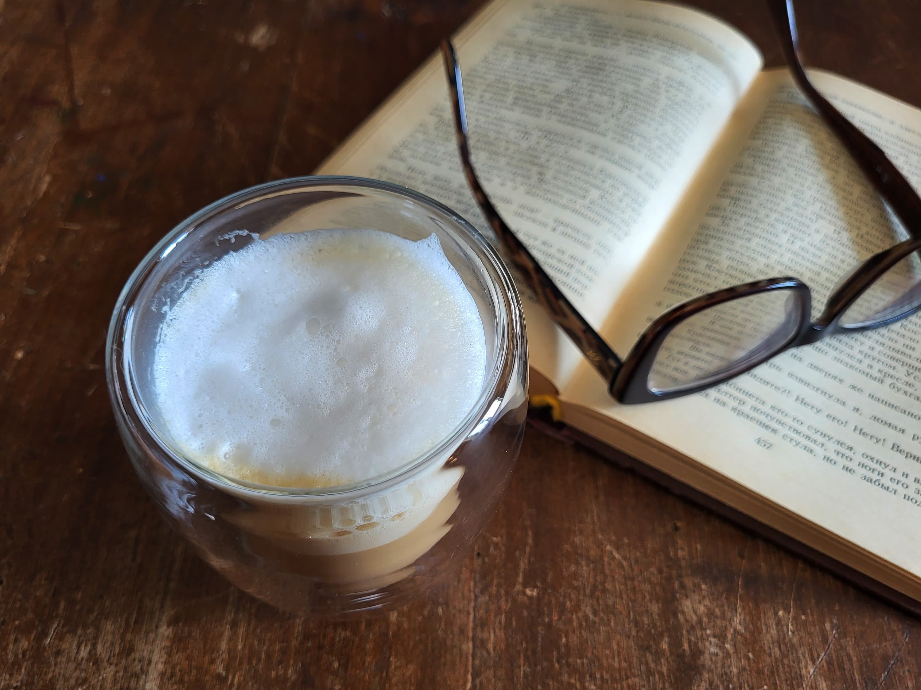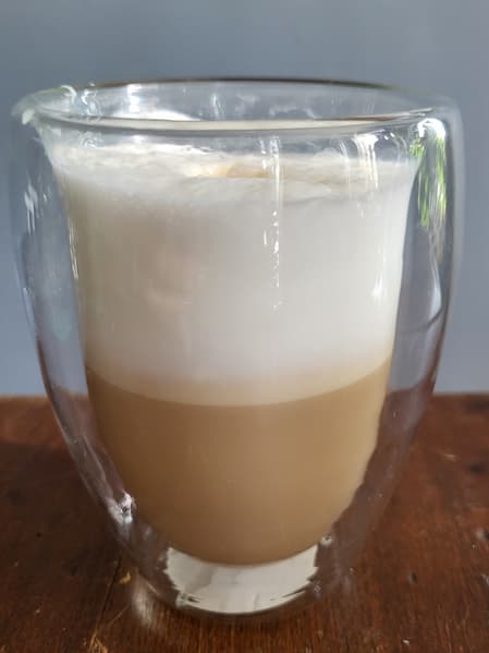 Нельзя сказать, что пена получилась идеальной, но мы взбивали ее всего 30 секунд. Если посмотреть на фотографии ниже, в целом виден объем получившейся пены: на левом фото пена занимает примерно ⅔ общего объема жидкости, на фото справа, после того, как мы добавили эспрессо (хотя, конечно, положено делать наоборот: вначале эспрессо, потом молоко и пена), пена занимает примерно половину объема, и на контрасте кофе и молока это достаточно хорошо видно.